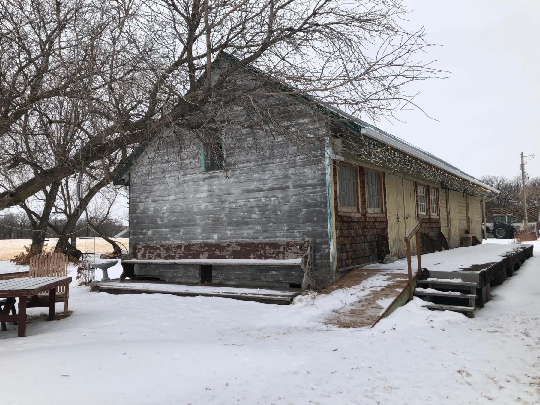 But you need more than an old bungalow to run a farm, and the yard had no other buildings so they also brought home an old abandoned lumber yard building from Treherne. An unused old concession stand is their garden shed.