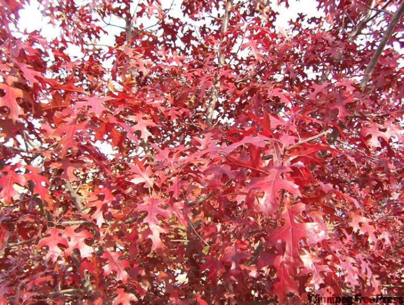 'Shooting Star' is a cultivar of Northern Pin Oak selected near the Lake of the Woods by Rick Durand. It is propagated by grafting buds of the parent tree onto seedling bur oak. It features the attractive bristled foliage of the red oak group combined with outstanding red fall colour: a rarity on trees grown in Manitoba. The fall colour is reliable and robust, with the glossy crimson foliage holding on through early fall frosts.