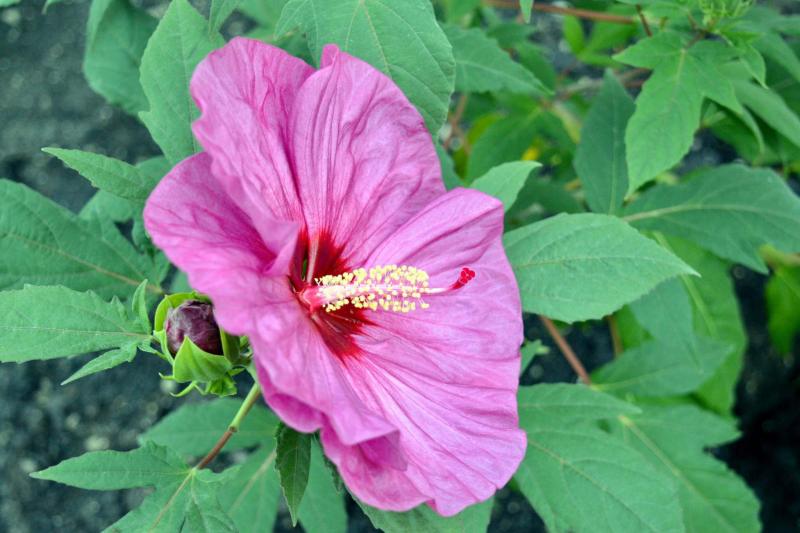 This summer, Larson purchased Summerific Berry Awesome, a zone 4a hibiscus hybrid which he plans to overwinter. A large shrub-like plant that grows to about 120 centimetres, Berry Awesome has midnight green foliage and massive lavender-pink flowers with a cherry centre that has a prominent stamen.