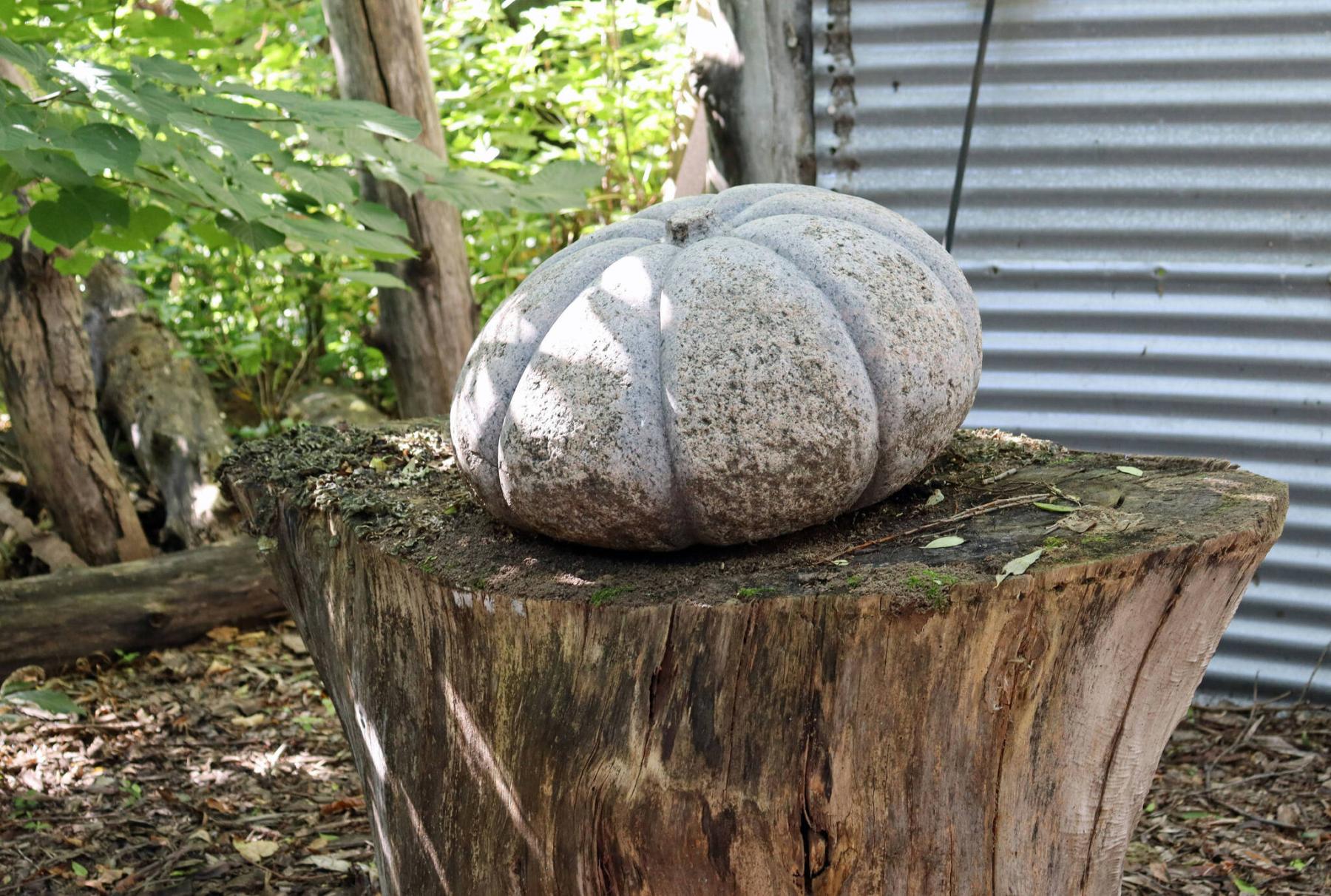 Looks are deceiving: A carved stone pumpkin sits perched on a tree stump.