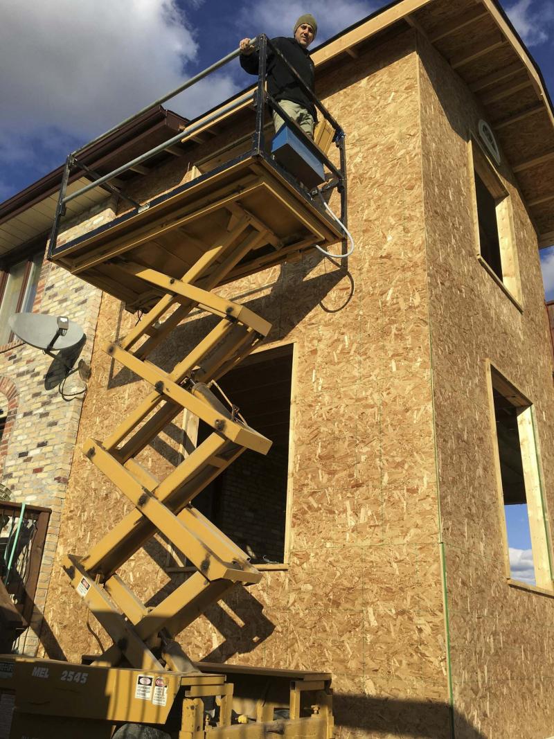 Marc Labossiere stands on the scissor lift platform, which has been maneuvered on a temporary wooden path at the exterior of the addition.