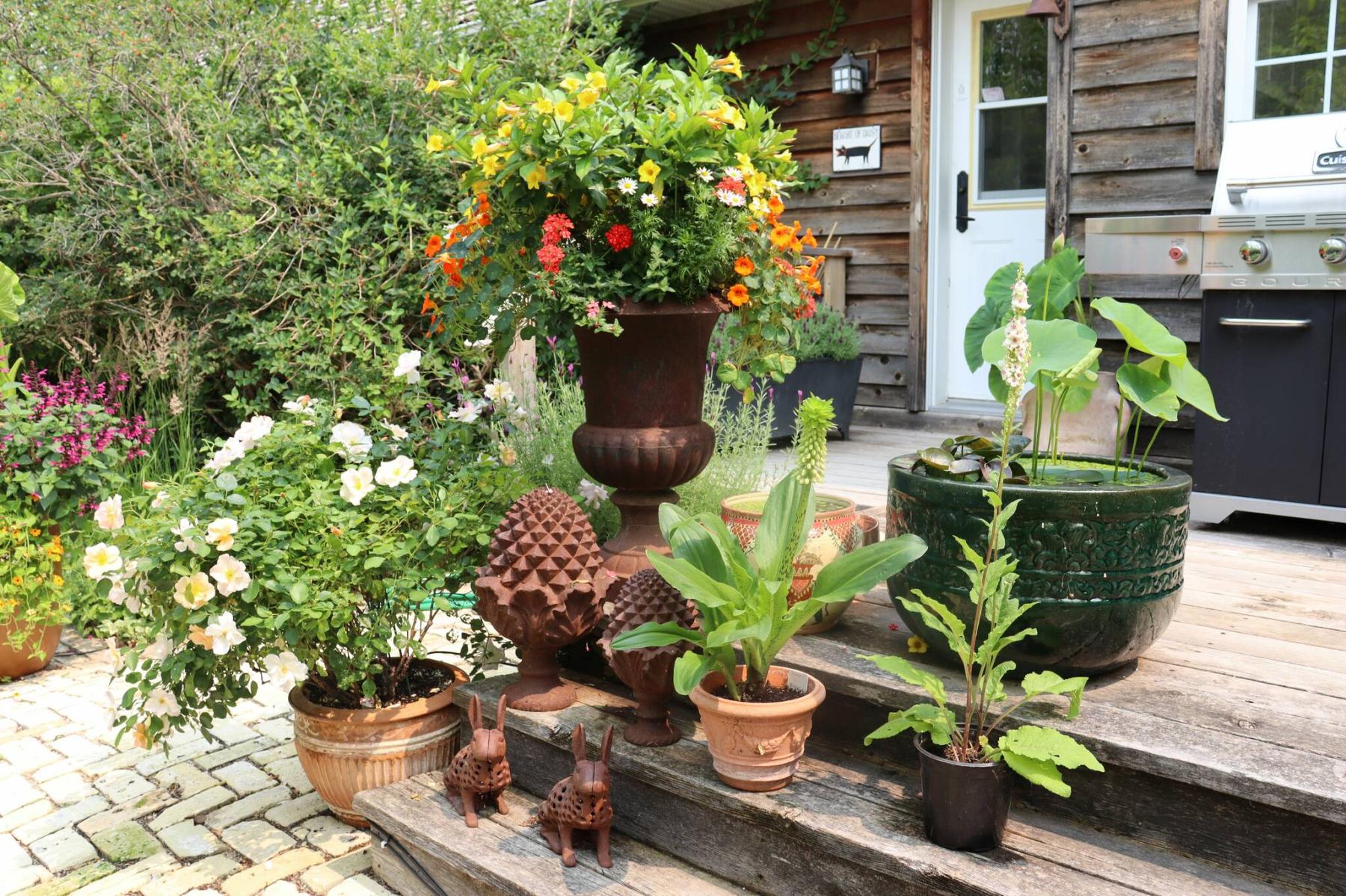 A potted rose sits at the edge of a vignette on the steps of the weathered cedar deck that faces into the courtyard. An elegant cast iron urn with a vivid arrangement of yellow, orange, and pink flowering annuals provides the highest point. Next to it is a miniature water lily garden in a dark green ceramic planter. Accents include vintage iron acorn finials and the most amazing, rusted iron rabbits. “Those came from Design Manitoba,” he said. “I wasn’t buying them for myself at the time but when they arrived, I knew they were coming home with me.”