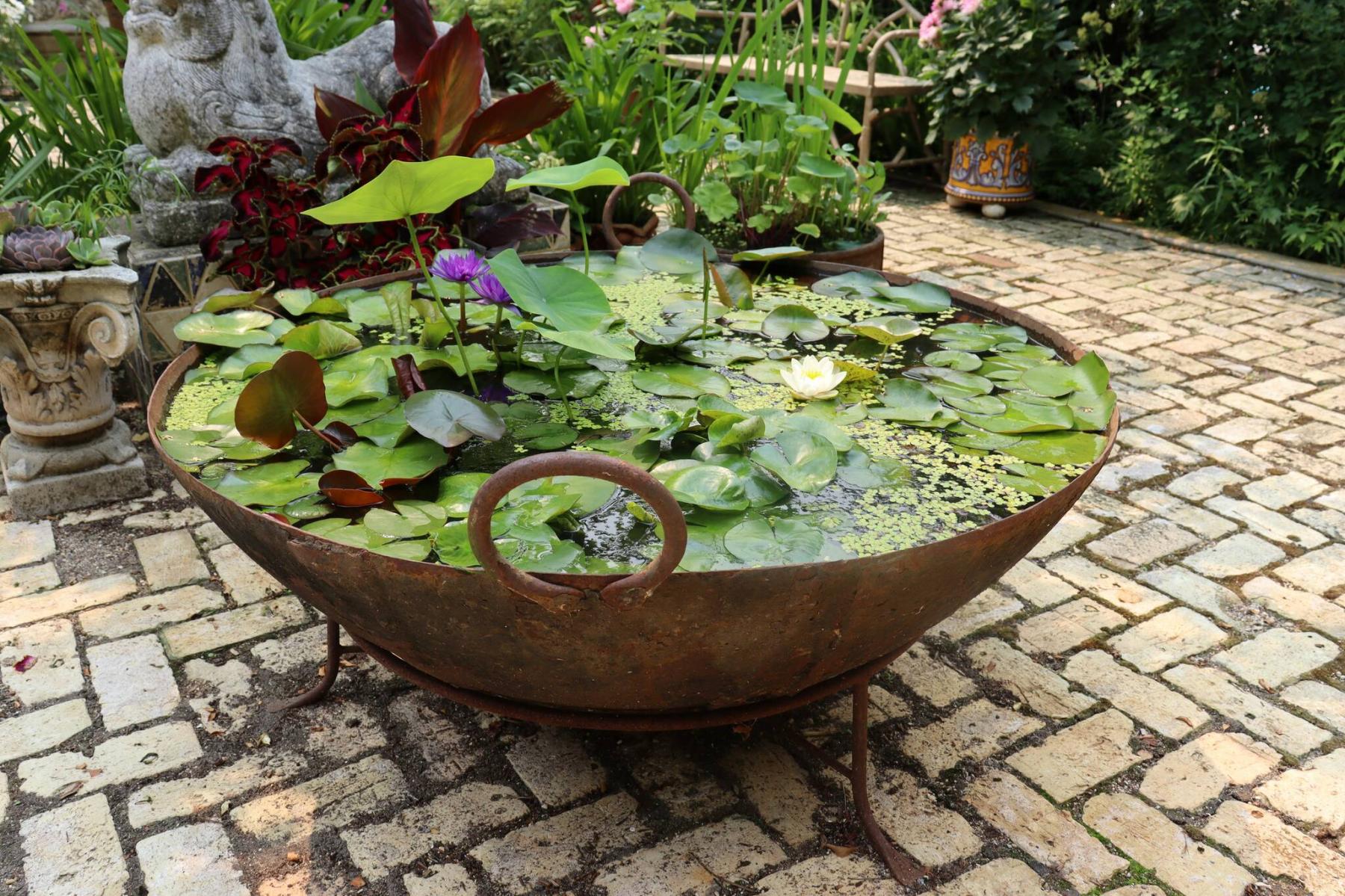 Piece de resistance: This vintage iron cooking vessel, 120 cm in diameter, is transformed into a water garden with water lilies and lotus.
