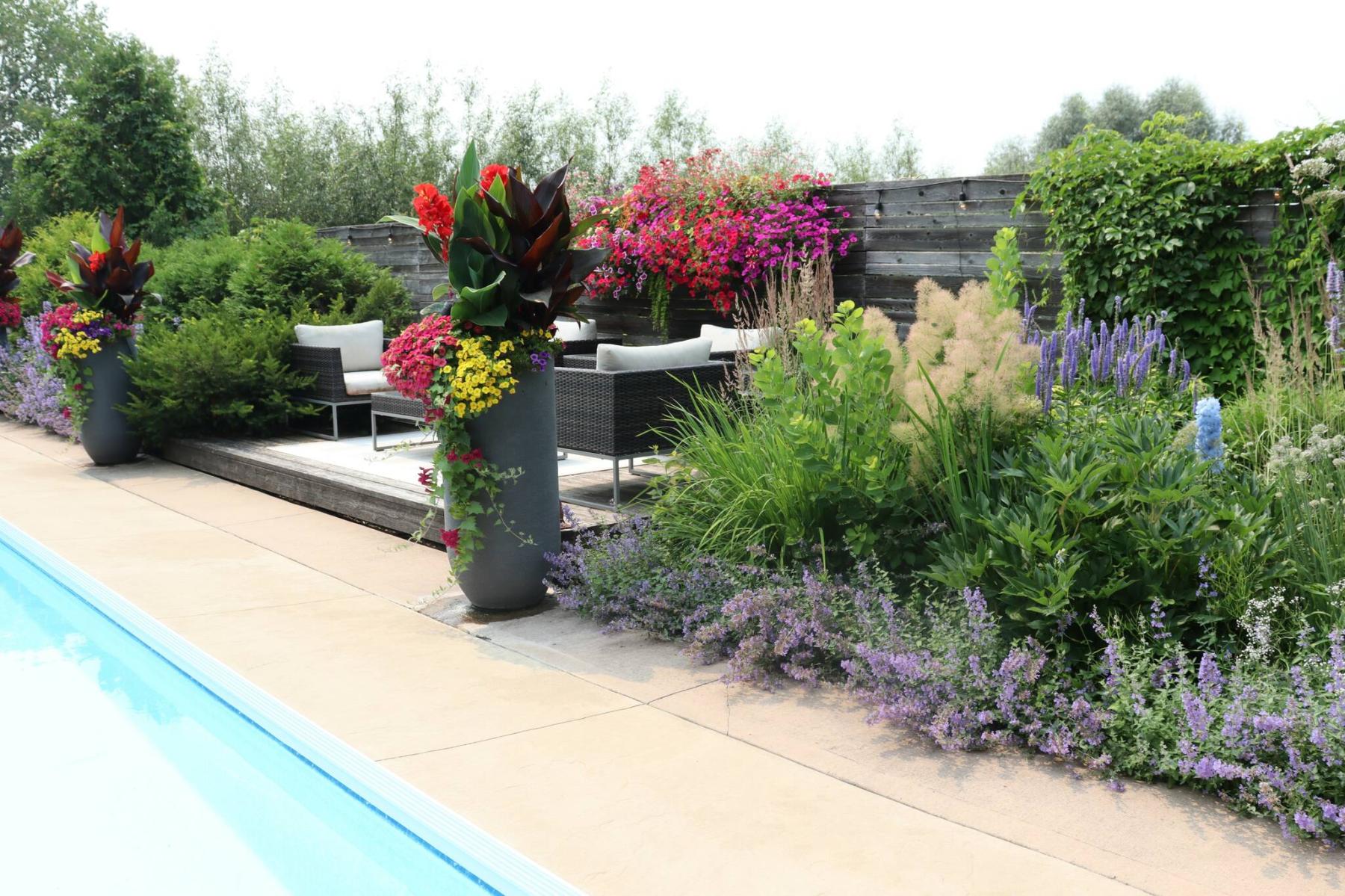 Tall poolside containers with canna lilies stand out in this contemporary garden with lushly planted linear borders.
