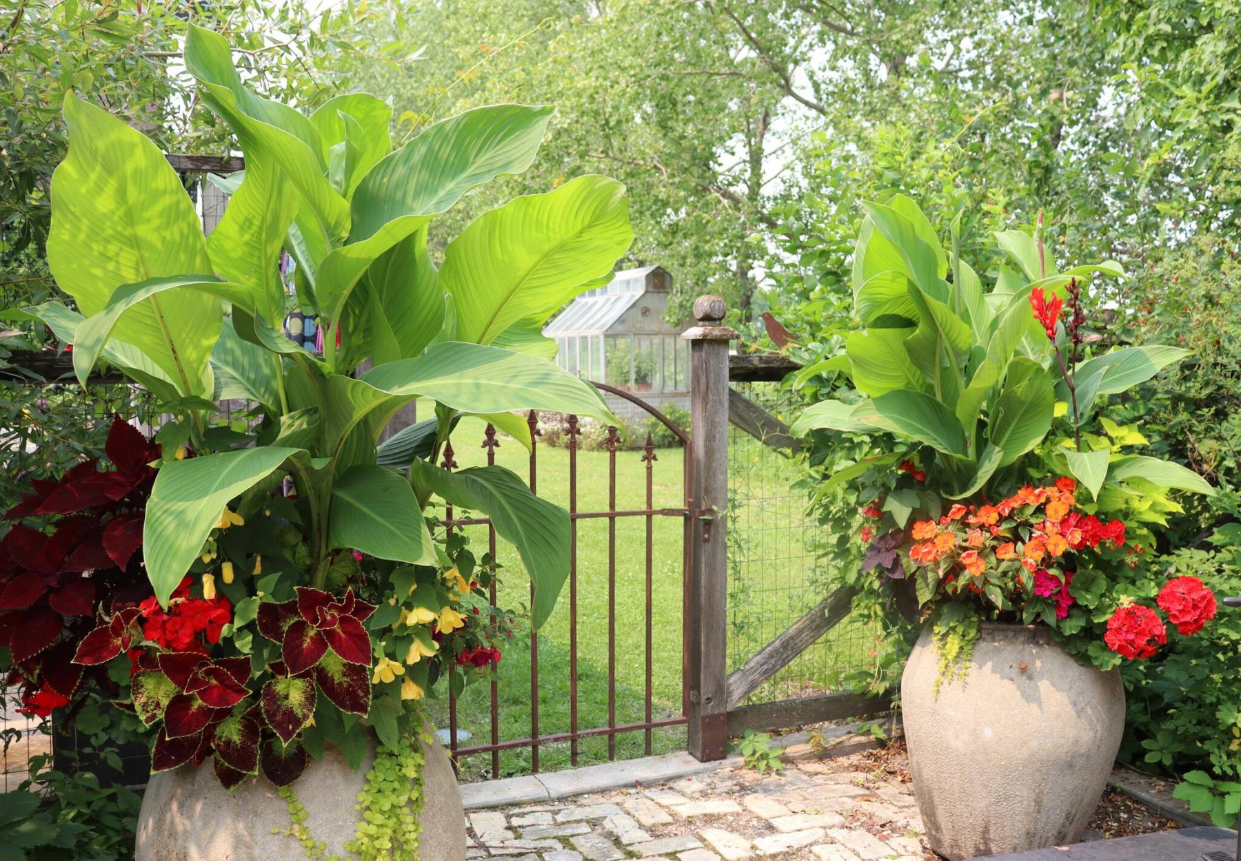 Stoneware planters with canna lilies that have recovered from earlier hail damage, flank an antique iron gate.