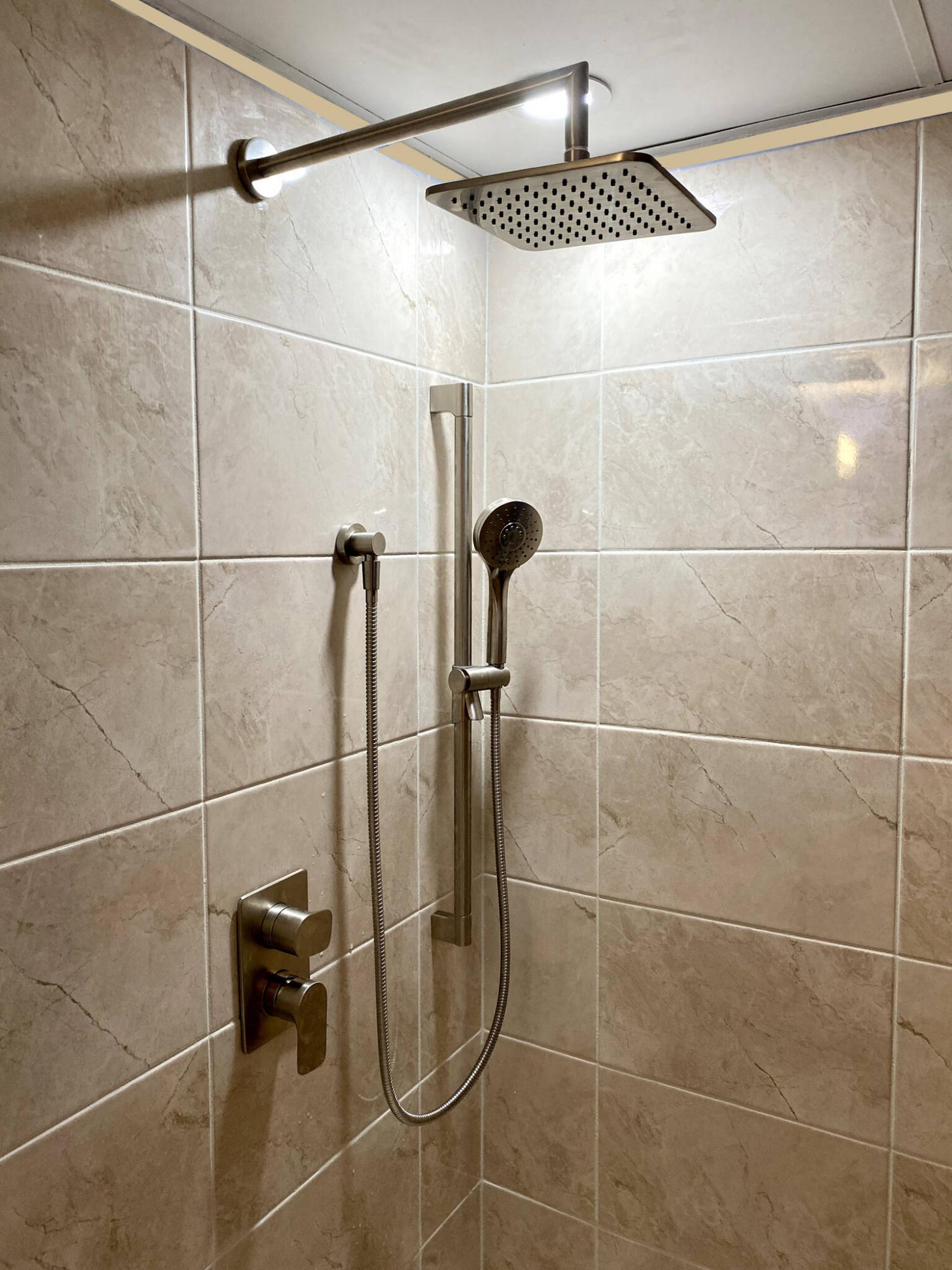 For this project, the homeowners chose a mid-sized rectangular tile, light beige in colour with marble-esk grains and striations. And to avoid the brick-look, the tiles were arranged horizontally, in vertical columns. The tiles were cut to accommodate the various faucet amenities, and a vertical bracket was mounted near the corner for the adjustable hand-wand cradle. The very next day, the entire area was grouted with a light-beige resin-based grout. Along the bottom edge of tiles nearest the shower base, the seam was sealed with silicone.