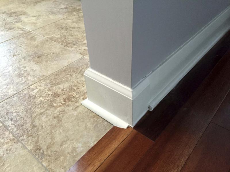 The lower quarter-round was tailored to accommodate the discrepancy in floor elevations from room to room.
