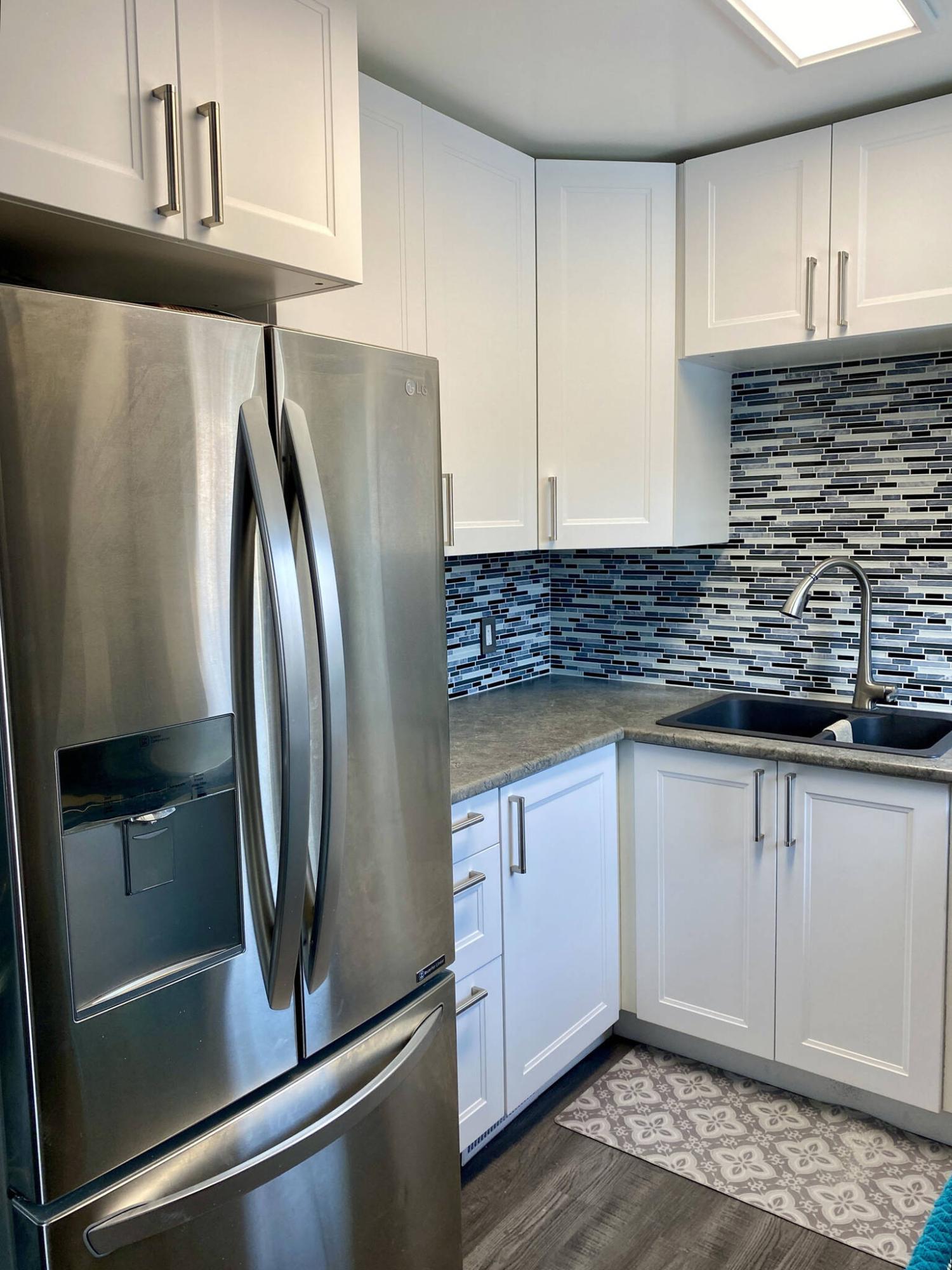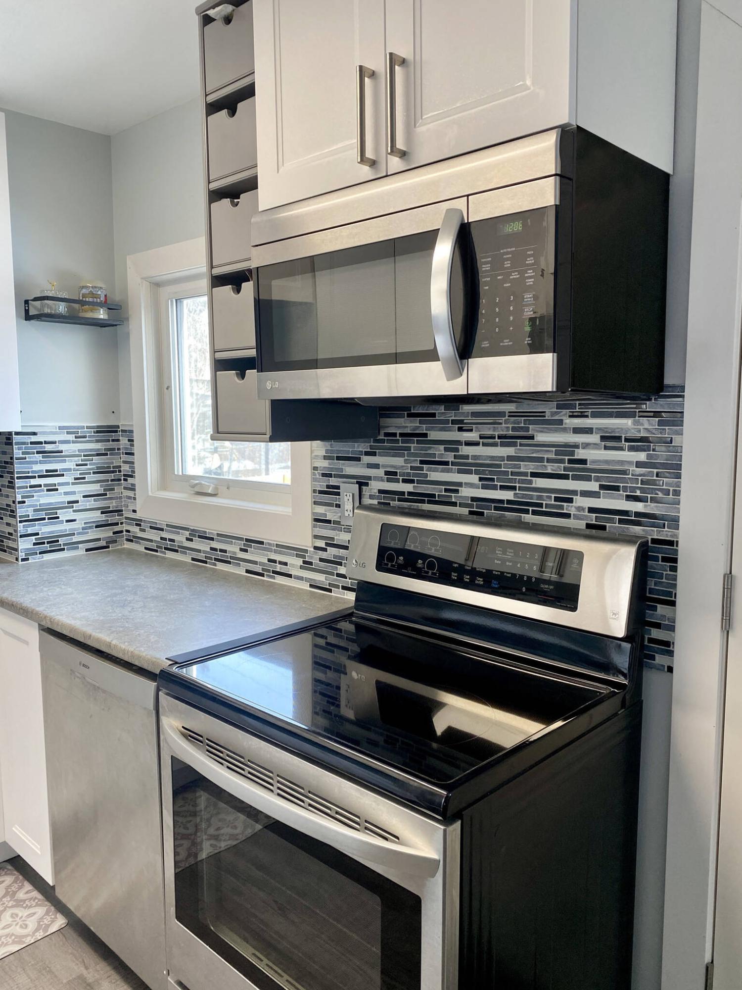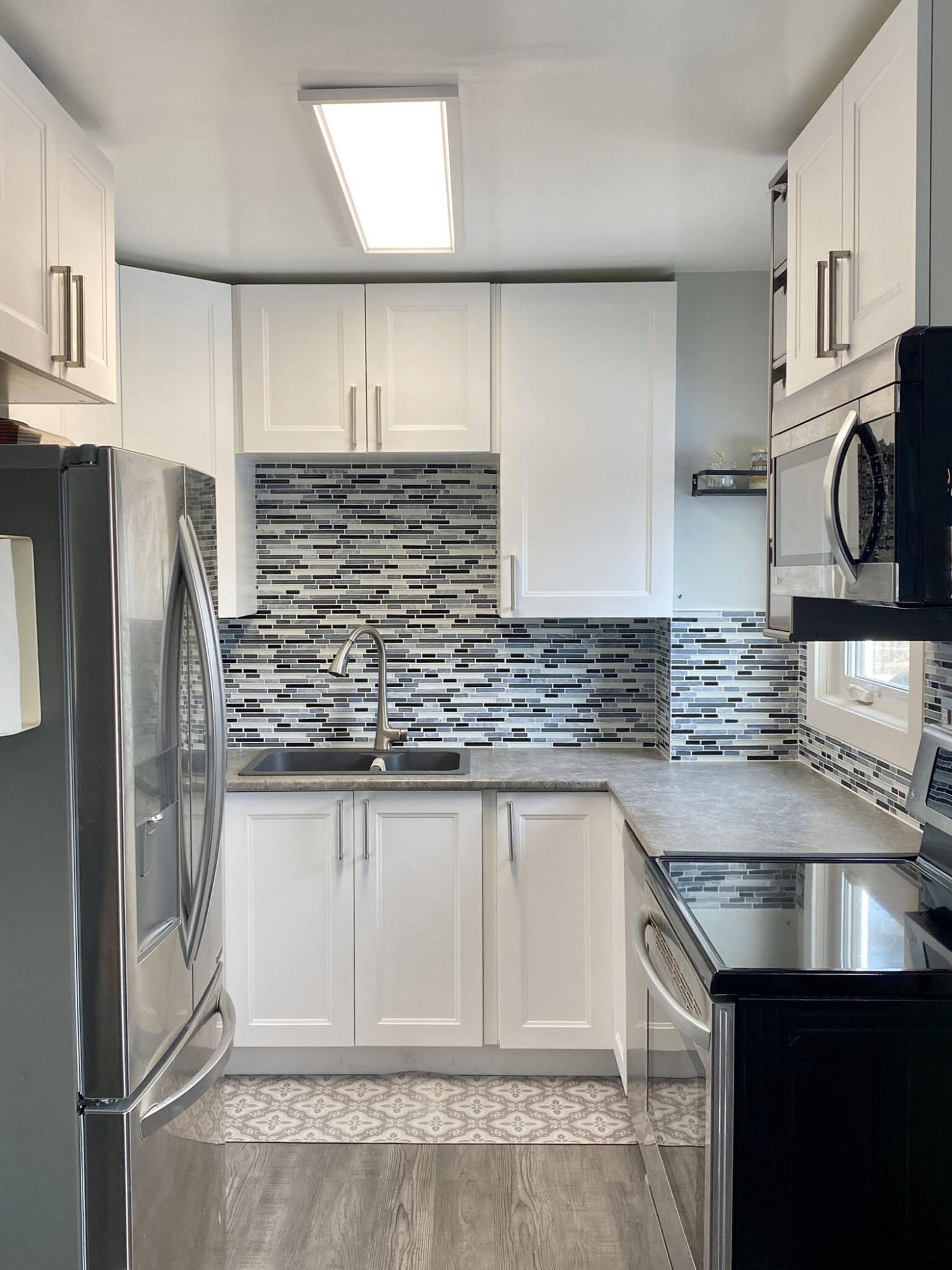 The white and lighter tiles tie-in the cupboards, while the light greys blend with the stainless-steel appliances, Arborite countertops and vinyl flooring. Even the darker-toned tiles feel right at home, drawing consistency with the black features of the stove and microwave.