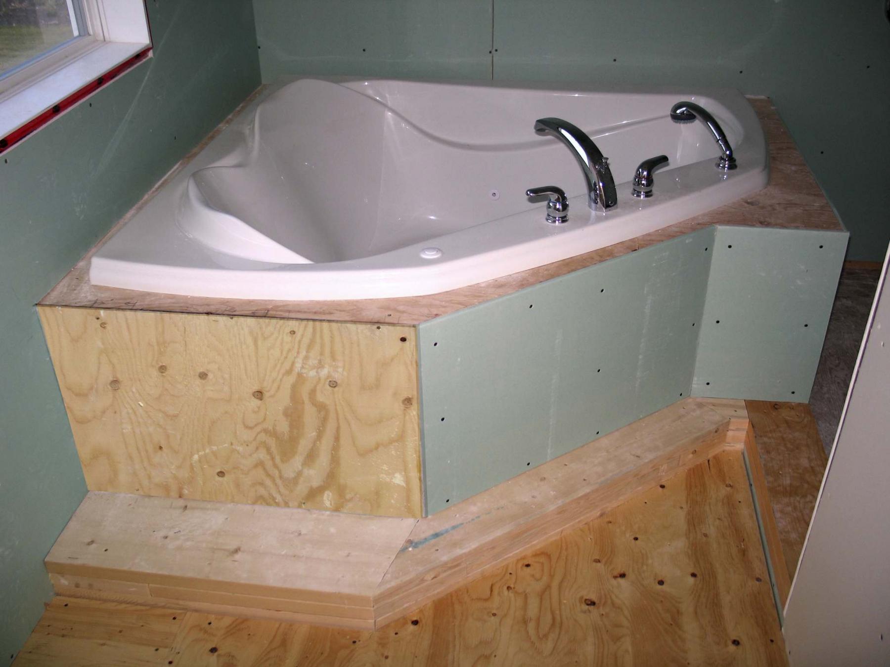 Once the tub frame was completed, the top was fitted with 3/4-inch plywood. The tub template was then placed into the desired position atop the plywood, so that the tub shape could be traced onto the plywood top. The traced area was then cut out using a jigsaw, and the tub was carefully set into position. The drain and water feeds were connected and tested, and the jet pump was tied into the dedicated electrical circuit. Once the tub was properly shimmed and free of any unwanted movement, aqua-board could then be affixed to the exposed sides, before being tiled.