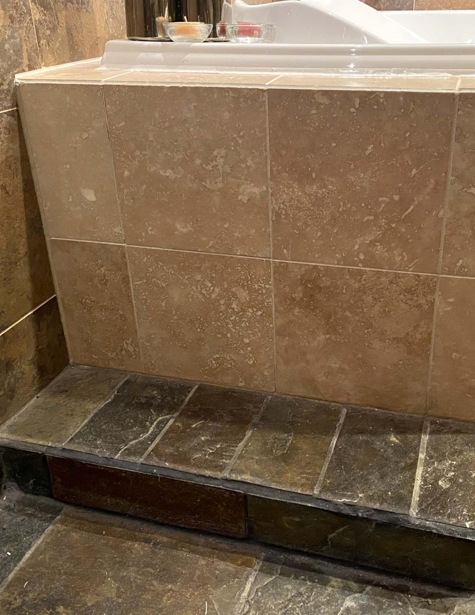 The grout lines around the perimeter of the access panel were filled with caulk for easy removal should the jet-pump require servicing.