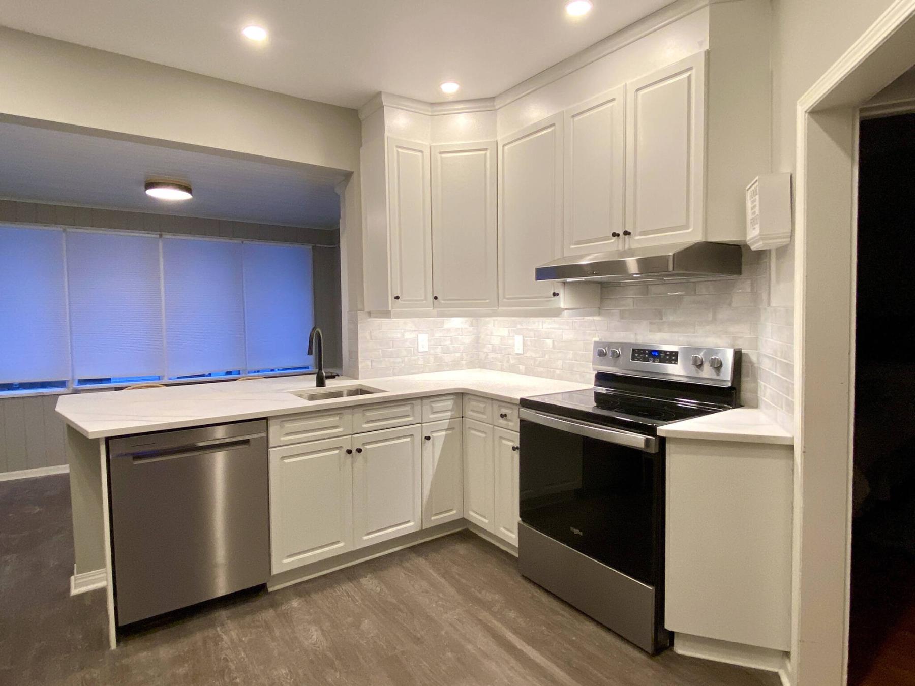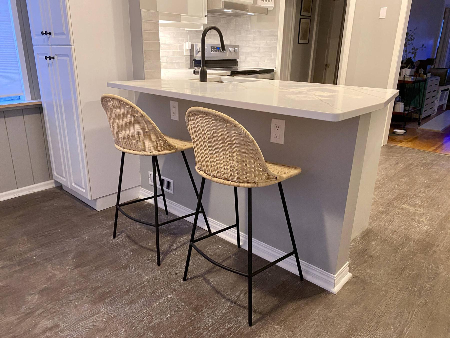 The backsplash chosen consists of light-grey, two-and-a-half by 10-inch tiles set on thirds-shift, to create a more modern look than the traditional brick layout. The next day, a very light grey grout would complete the backsplash installation tasks. Finally, the outlet and switch covers were mounted, and a small array of baseboards and casings were re-installed to accommodate the new configuration of the partial wall and beam area. This well-coordinated process, achieved in only ten working days, is sure to provide a lifetime of enjoyment.