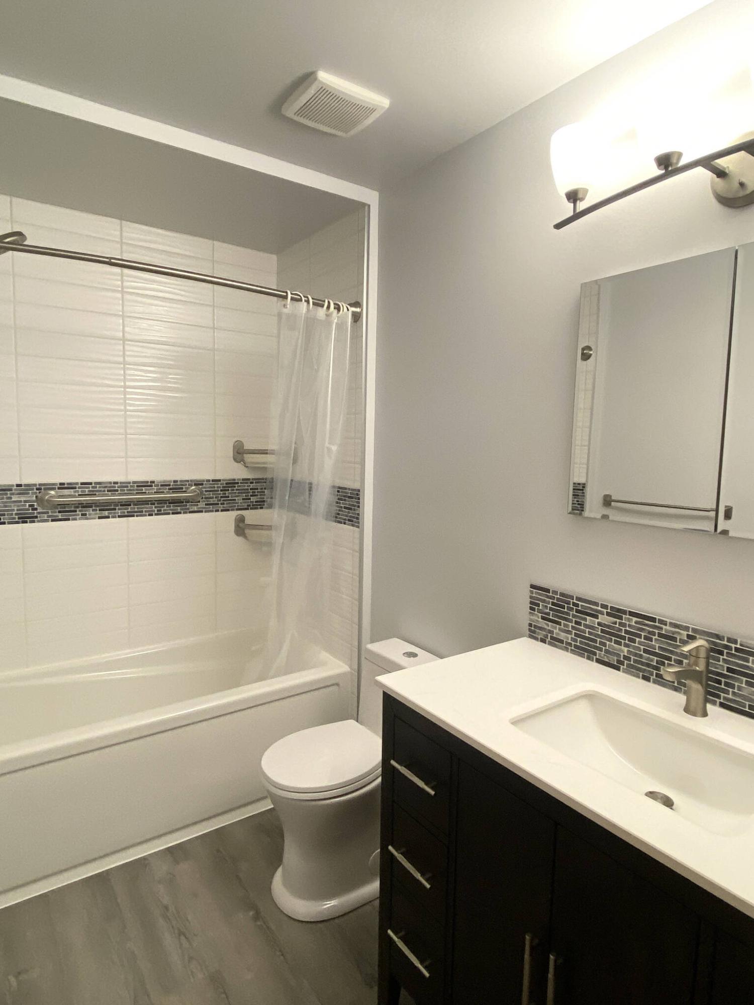 A dark vanity cabinet with white quartz countertop was chosen to contrast the light greys on the walls and floor.