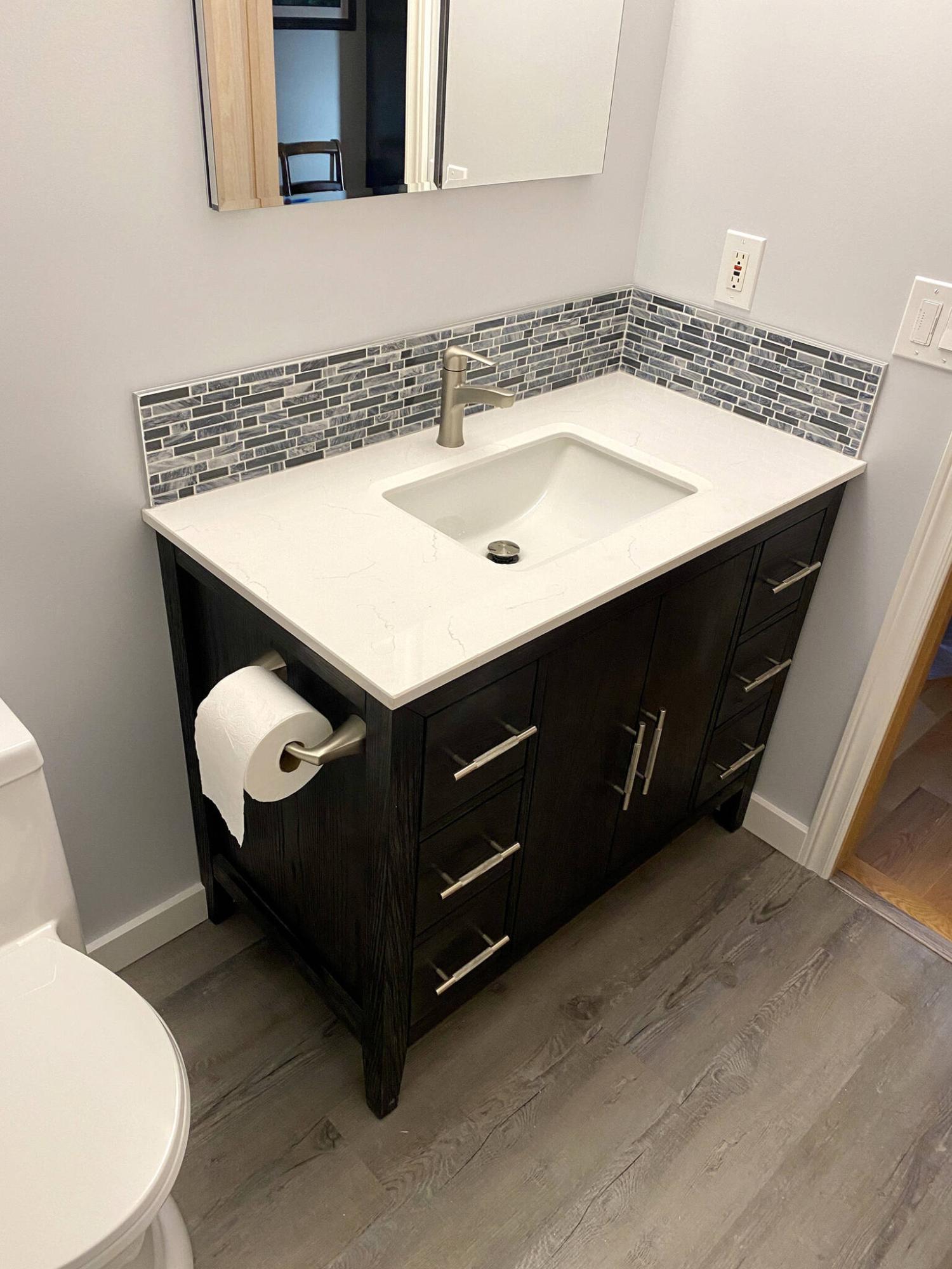 With the hurdles of the extra framing surmounted, the vanity was set into place with water and drain tied-in and backsplash installed, below the previously positioned inset medicine cabinet and new vanity light fixture. Once the one-piece toilet was mounted, the entire space received white and clear caulks and silicones where required.