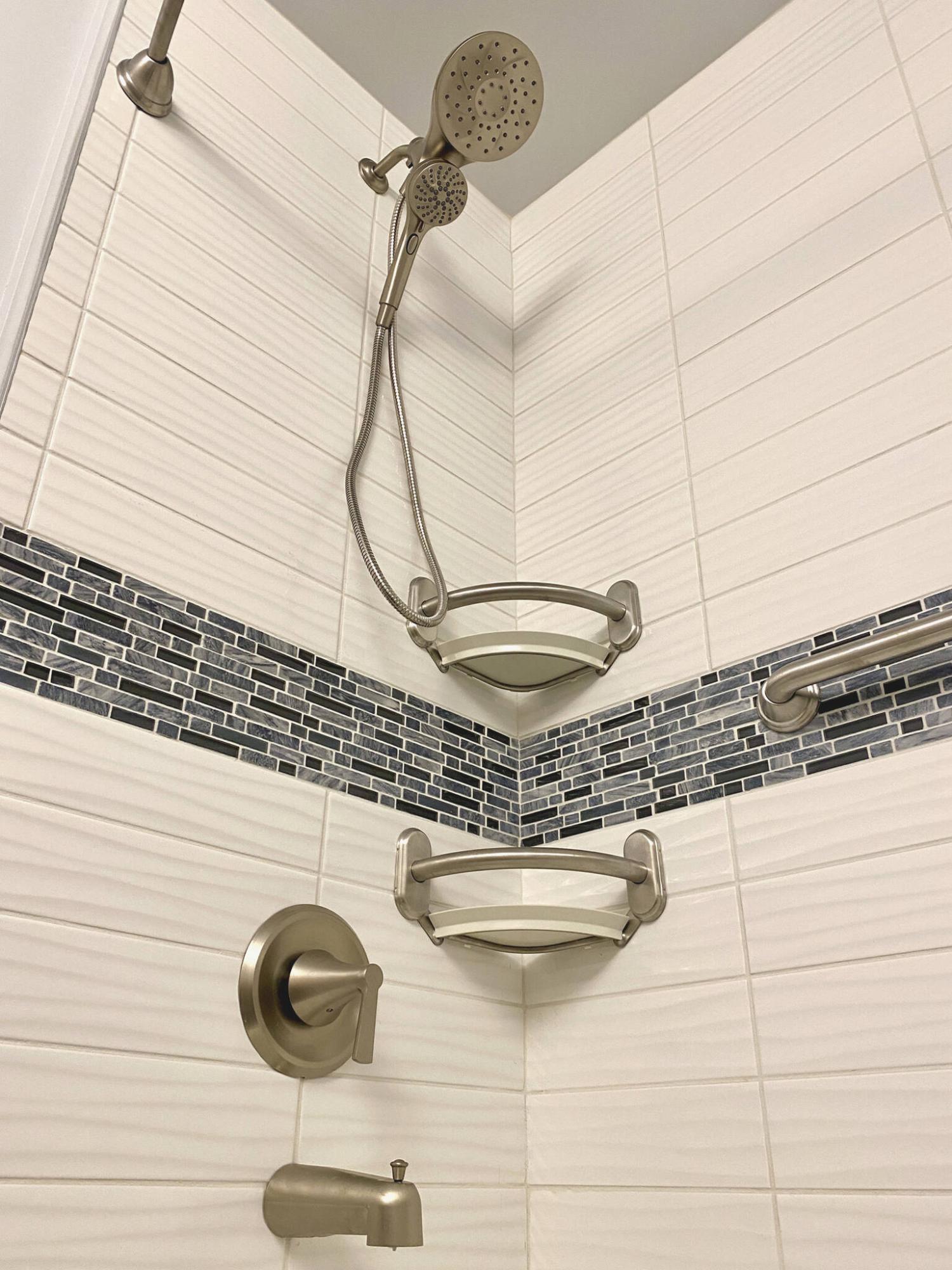 The near one-and-a-half-inch protrusions created by the extra framing on each side is complemented by a two-inch bulkhead height, which were later adorned with inset brushed-nickel tiling edge from floor to ceiling to cap the white-profile four-by-16-inch tile set in a horizontally stacked design, with a decorative contrasting mosaic stripe at the midway point. All amenities were also chosen in brushed-nickel for consistency throughout the bathroom.