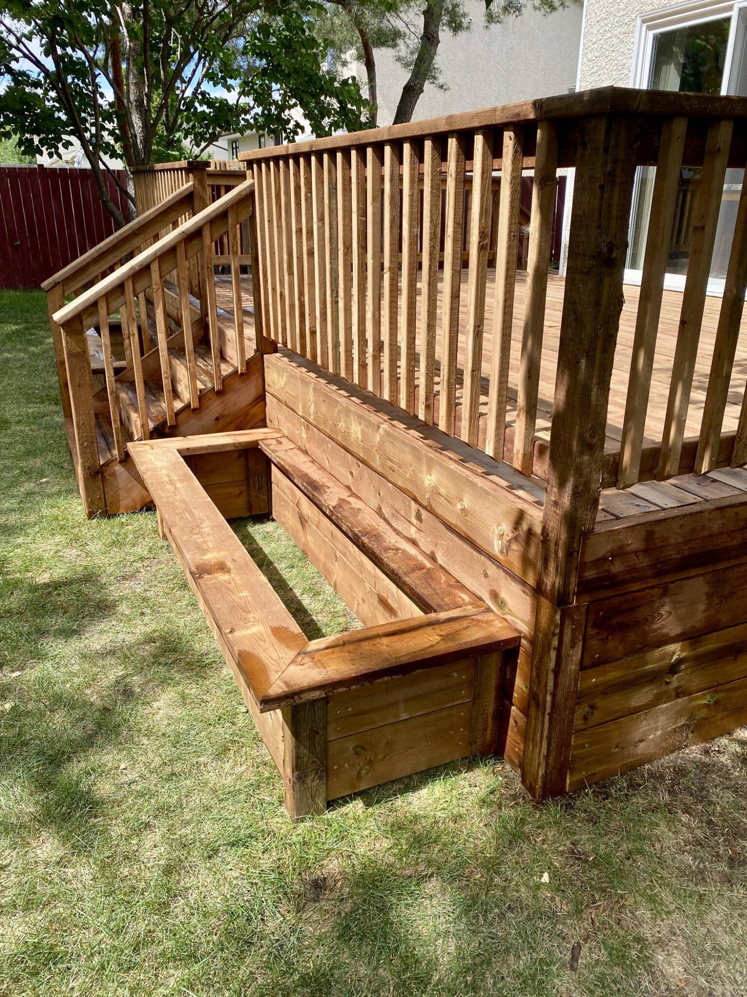 With the main structure once again sound, new staircases were fabricated on site by cutting custom stringers. The stairs at the back access would not change in width. However, a new four-foot staircase was introduced along the front side of the rectangular deck to provide easy access to the big of the yard. To fulfil the homeowners’ request, two planter boxes would also be introduced, one on either side of the centred staircase.