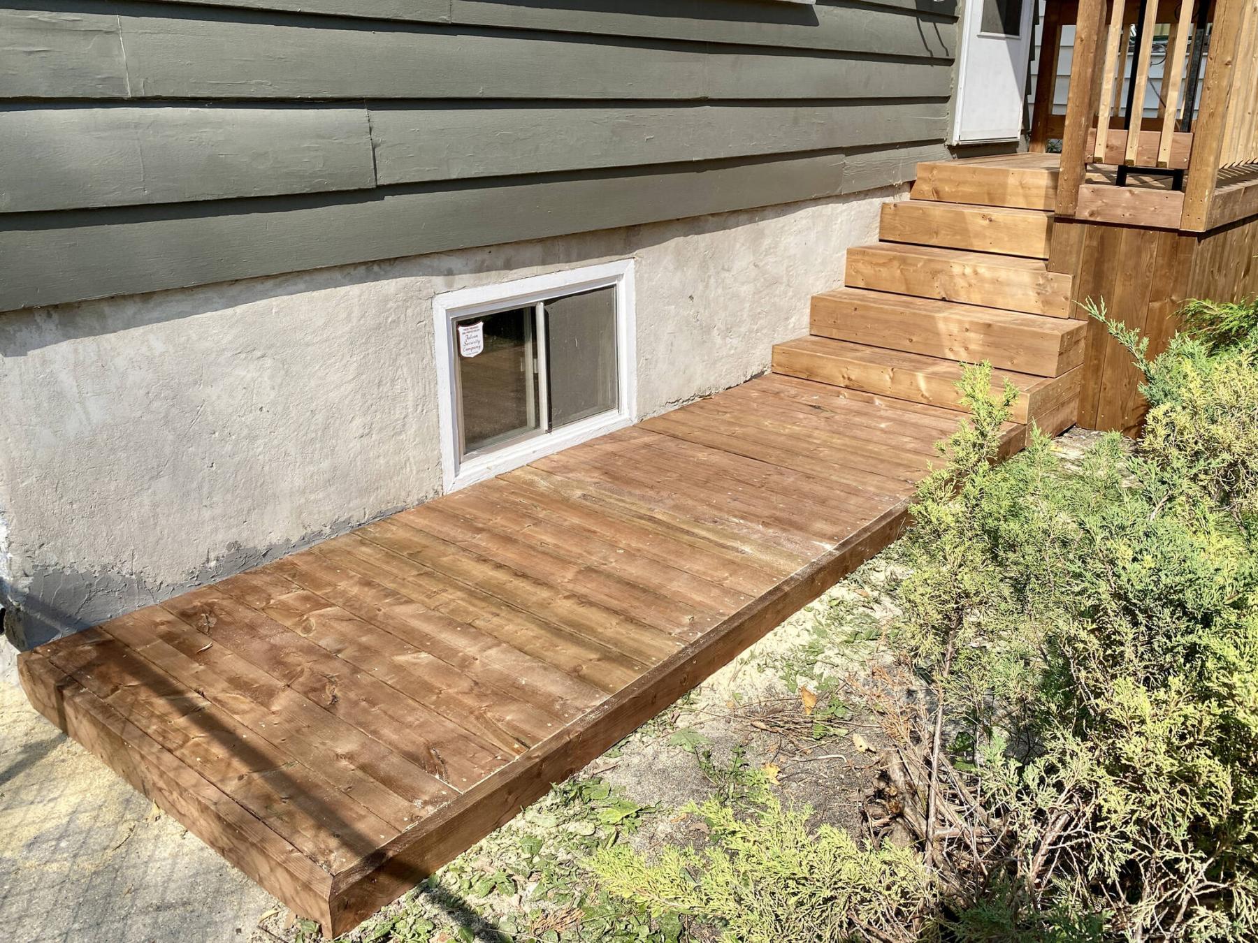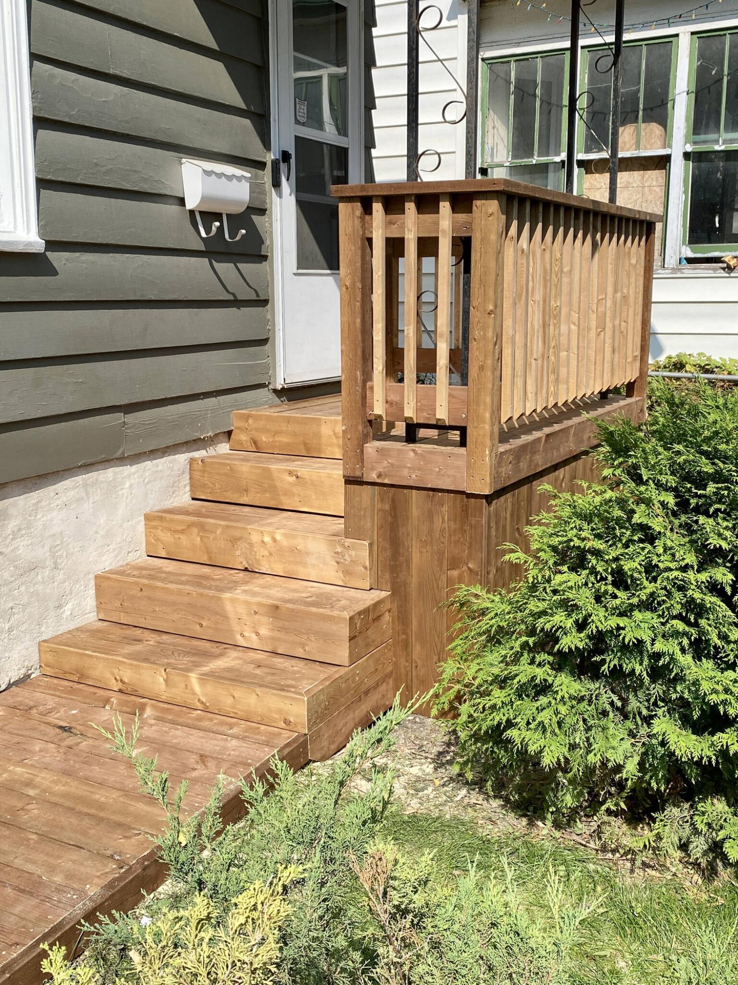Treated lumber is used to sheathe the entire structure, completely concealing the old concrete porch steps.