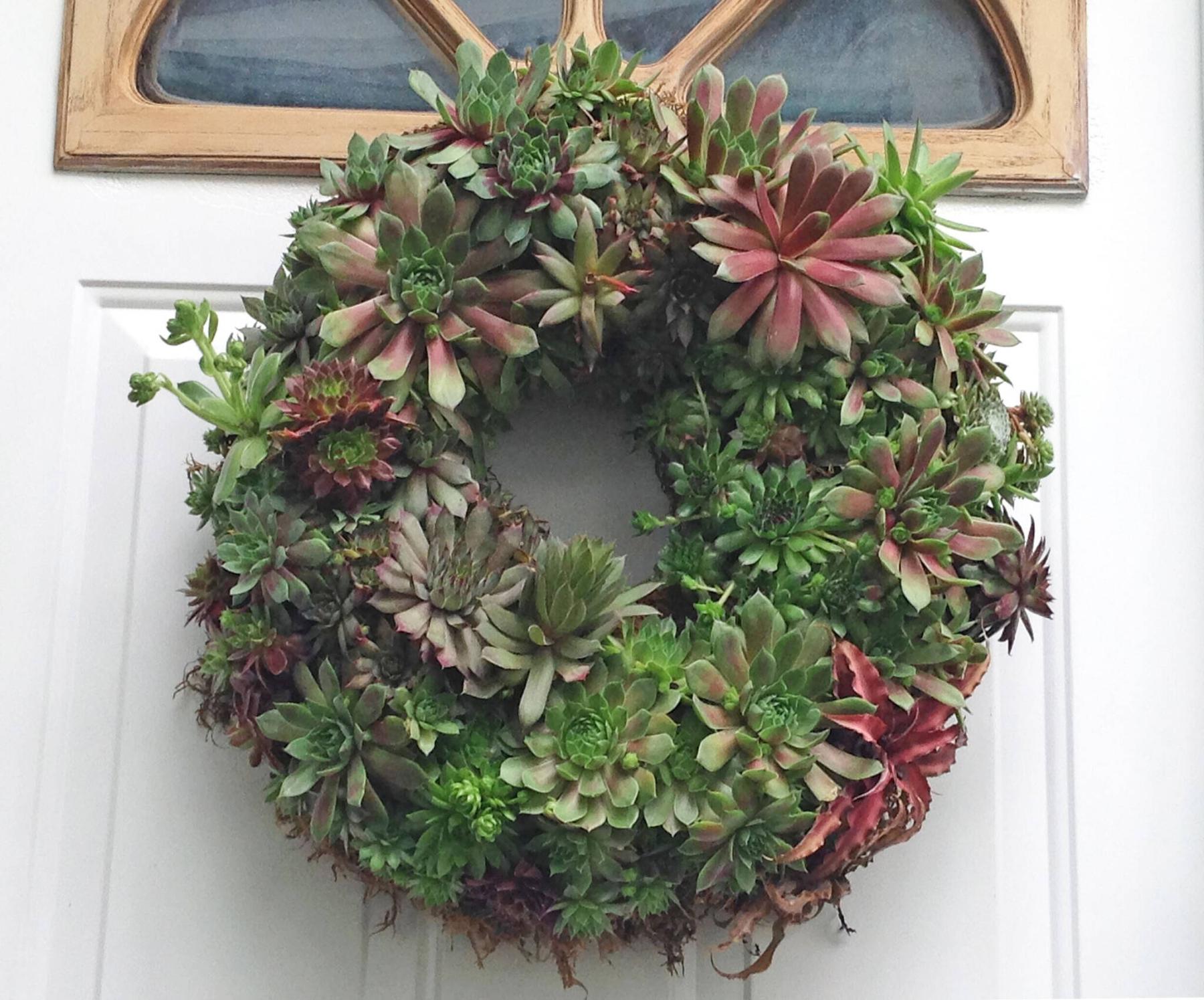 Decorated with cold-hardy hens-and-chicks, this succulent wreath is placed in the ground during winter and covered with leaves and deep snow cover.