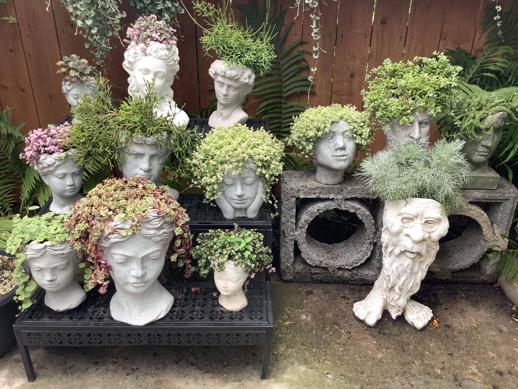 Her taste for the unique and unusual extends not only to the diverse succulent varieties she seeks out, but also to the eclectic stone representations of heads used as planters to display her elaborate creations.