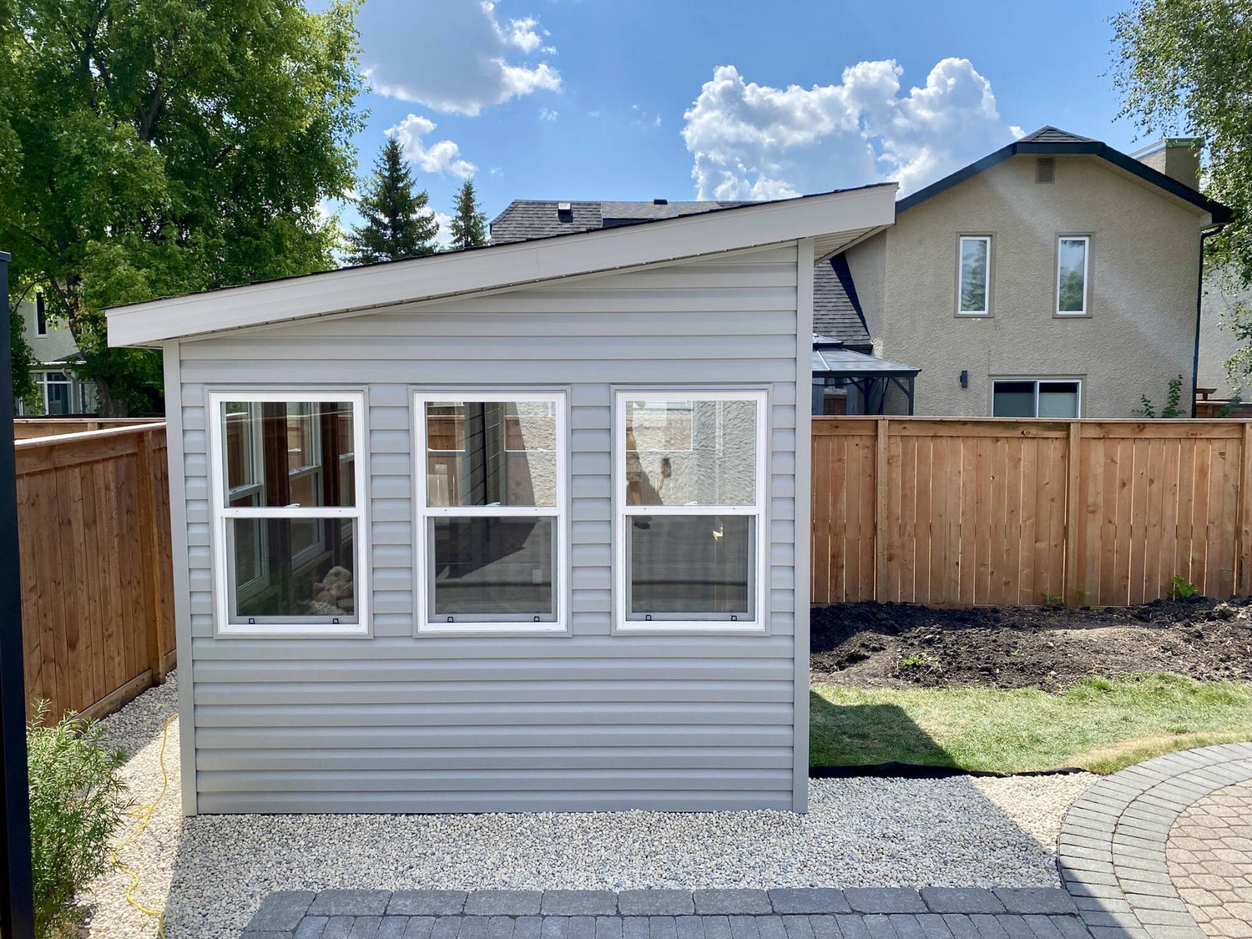 With the roof sheeting in place, the walls were then sheeted to close-in the structure, minus the rough openings for the windows and door. The slider windows were then hoisted into place within each respective rough opening, secured to the structure using the surface mount nailing fin. The same procedure was used to mount the static windows as well. Once this step was achieved, I called upon my good bud Geordie Cruickshank at PrairieSky Roofing to complete the shingles, clad the fascia and soffits with aluminum, and install the vinyl siding based on the colours chosen by the homeowners (to closely match the deck facelift achieved previously). The PrairieSky crews did an outstanding job decoratively sheathing the structure, which then allowed me to return to complete a few remaining tasks. The interior space was adorned with vinyl plank flooring. The screened door, which features retractable glass and screen from an upper cannister, was then secured to the custom jammed that had also been clad with aluminum. The final task involved drilling the mounting holes on the door for the handle and lock mechanism. The gazebo was ready for use, and the homeowners couldn’t wait to give it a try that very evening.