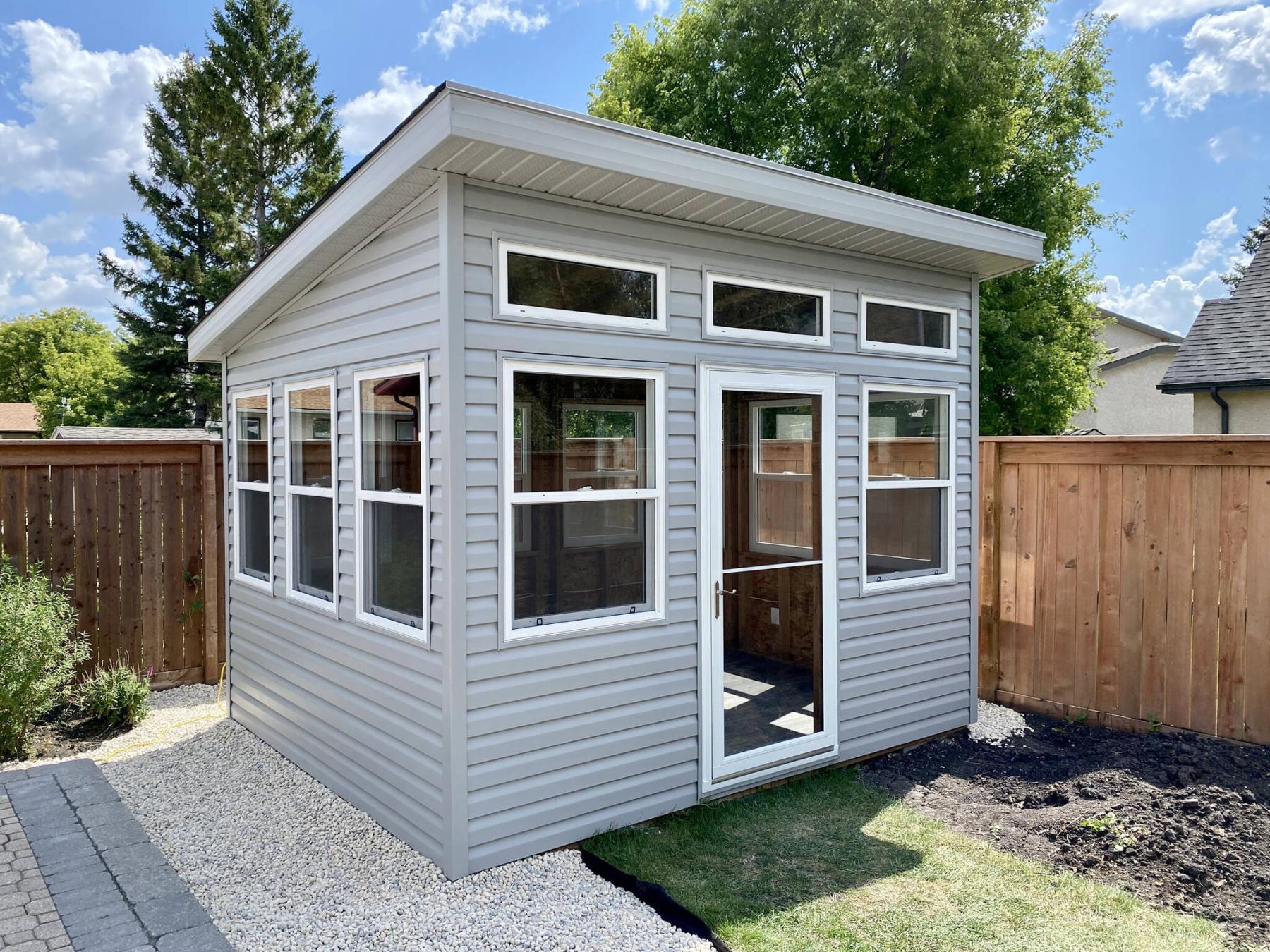 Once the dimensions were established, calculating the framing approach would greatly depend upon the number of windows, placement of windows and the entry door, as well as the style of roof. In this instance, a slanted or sloped roof was chosen mainly for the appealing “look”. Screened slider windows are distributed equally along every wall, with equidistant spacing. Along the front wall, a retractable glass-screened door is centered between the two sliders. Finally, three static windows are introduced above the front facing windows and centered door, to eliminate the unwanted dead space on the high side of the sloped roof.