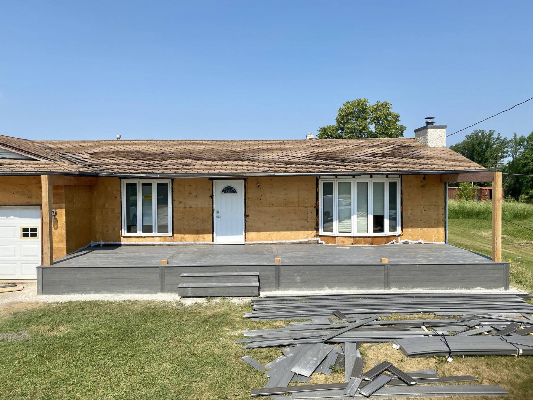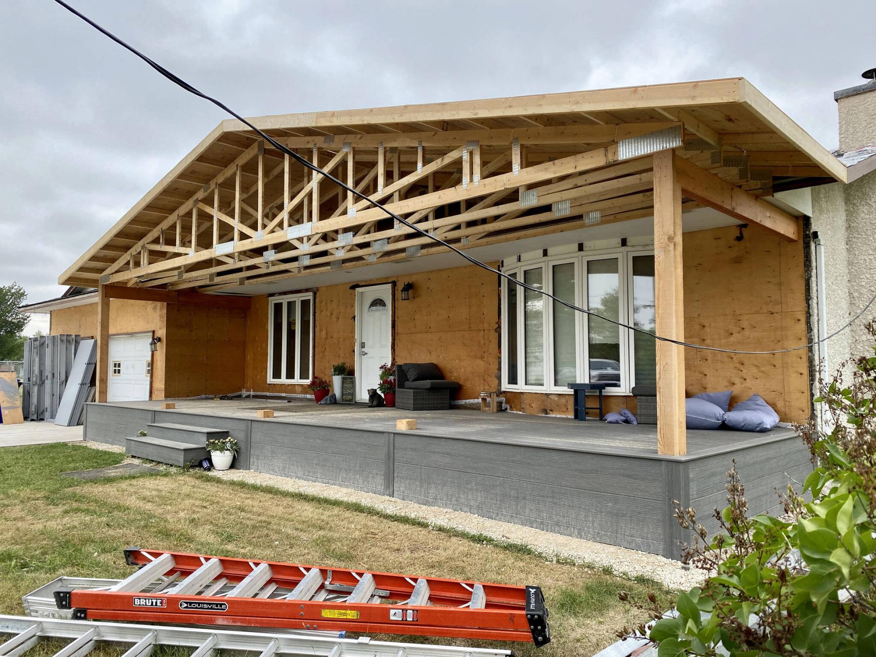 Sometime mid-spring, the next phase of the front porch-deck and roofline would begin. The two outer 6x6 fir posts were set into position, allowing the installation of the main laminated LVL beams on either side. These beams are supported along the front face of the exterior wall, and the two outer posts that sit directly atop the main beam, and helical pile below. Three temporary inner post decoys were placed along the front of the deck’s framework, and the decorative composite top-decking and fascia was installed throughout. Once this step was completed, focus would be placed onto erecting the new roofline. That’s when a major issue presented itself.