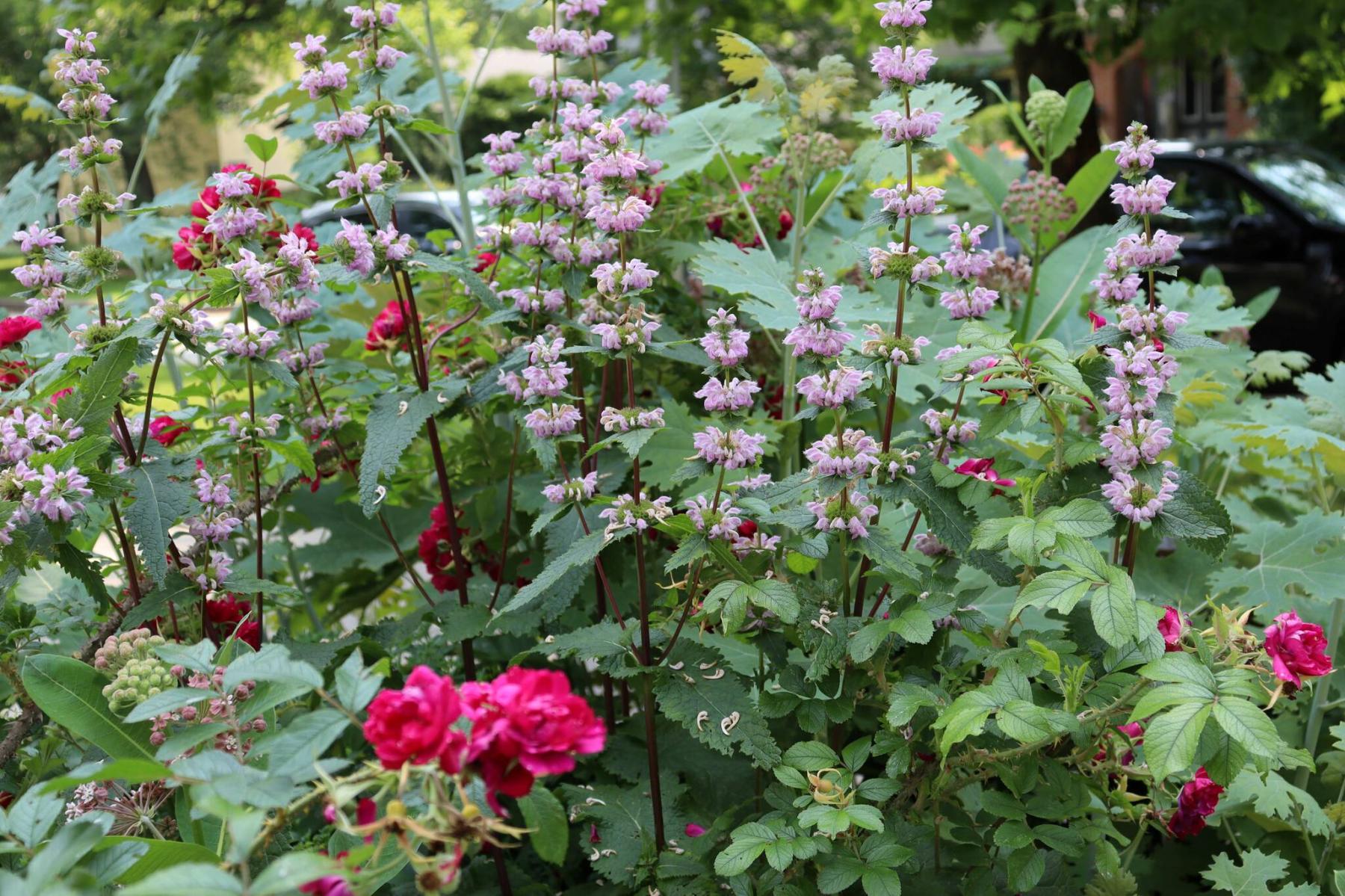The boulevard garden includes some shorter plants as well, including irises, Lamb’s-ear, and a mass planting of perennial cranesbill geraniums with mauve flowers. A border planting along the sidewalk entrance to their house is planted exclusively with tall plants, most notably common milkweed with paddle-shaped leaves and pink flower clusters, a captivating clump of Jerusalem sage (phlomis tuberosa) with woolly lavender-pink flowers on dark burgundy stems, and Rosa F.J. Grootendorst rose, believed to have been bred by Manitoba’s Frank Leith Skinner around 1908 but later appeared as a Dutch release.