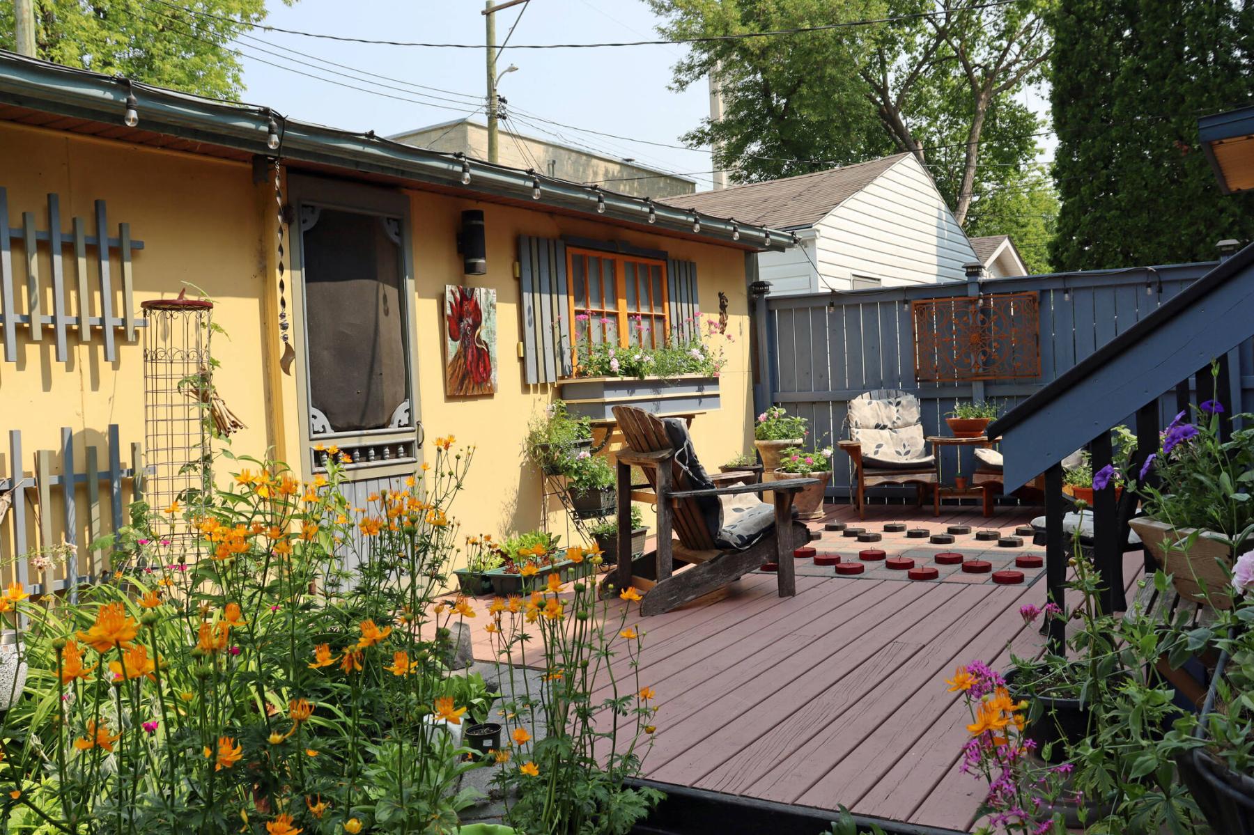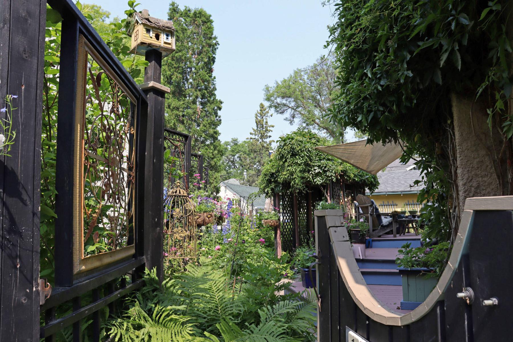 A classic arched gate designed and built by Alan leads to their backyard but also serves the dual purpose of diverting water from the roof of their house and redirecting it to where it is needed. A pair of artisan-made Canadian First Nations moccasins hang on the front of the gate. Audrey is a retired operating room nurse.