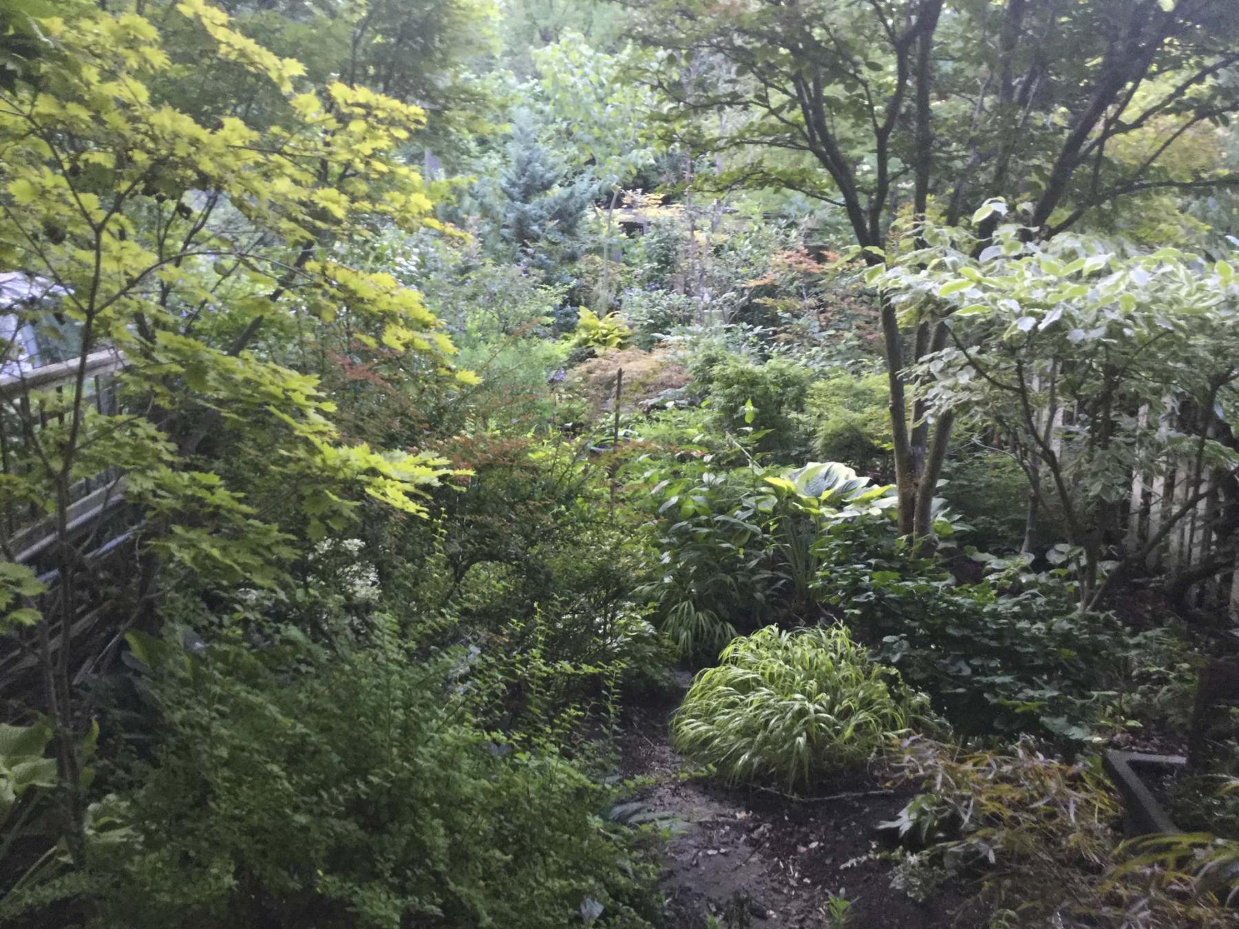 The harmonious view of Marjorie Harris's garden from her dining room window.