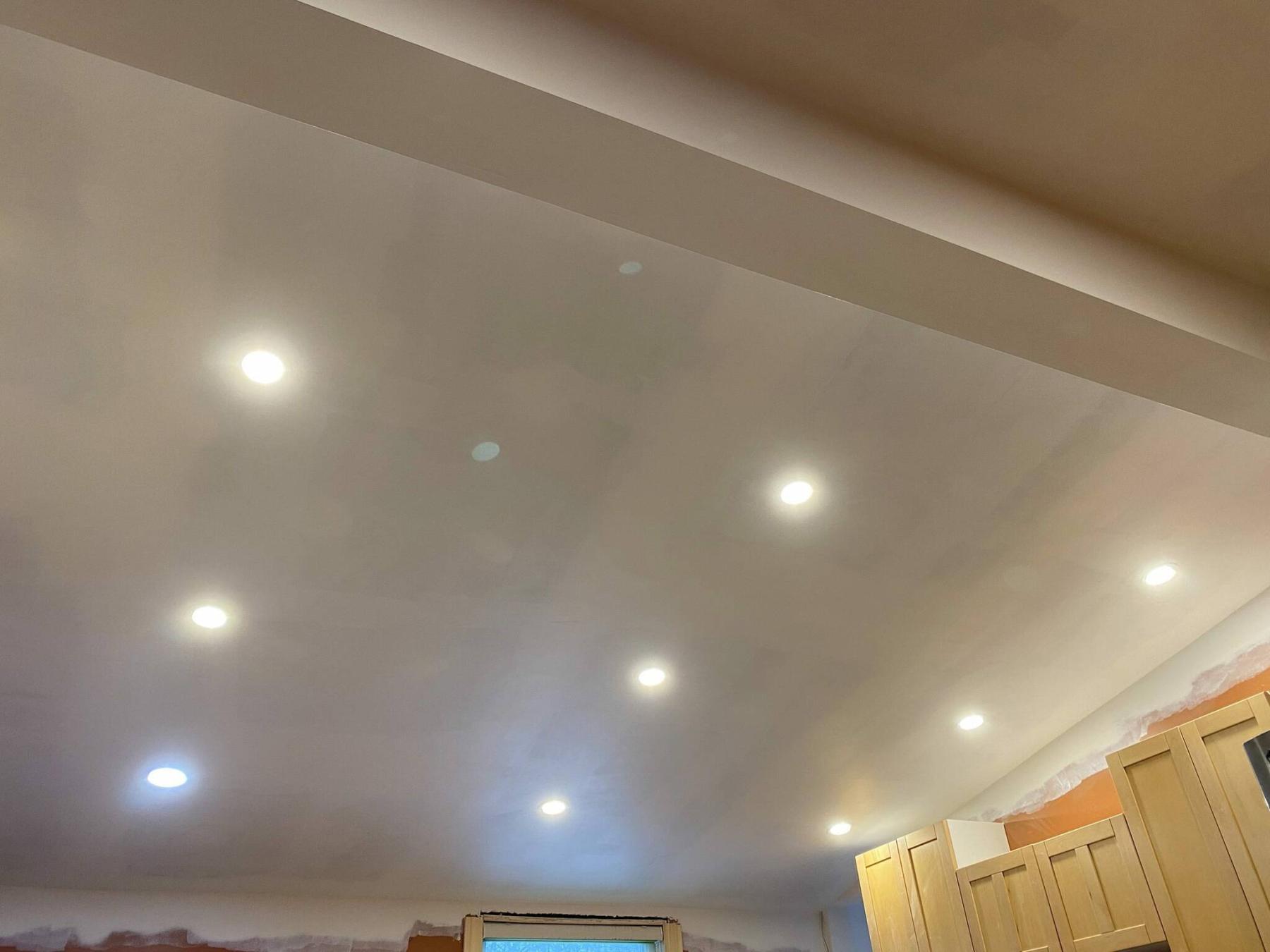 The taping and mudding process was typical. The long and short seams were first taped, while the corner seam along the entire perimeter of the “new” ceiling was achieved last. The subsequent coats of finishing mud hid the tape more and more until the final skim coat produced a near smooth surface throughout. After allowing the final coat of mud to cure overnight, light sanding along all areas ensures a flat and cohesive surface at all seams, including the corners where the ceiling meets the walls. With the newly introduced areas sanded, a coat of primer is added to seal the surface until the homeowner is prepared to have the entire house interior painted. Until that day comes, at least the ceilings look fresh and new. And, let’s not forget about how much more light the new LEDs provide.