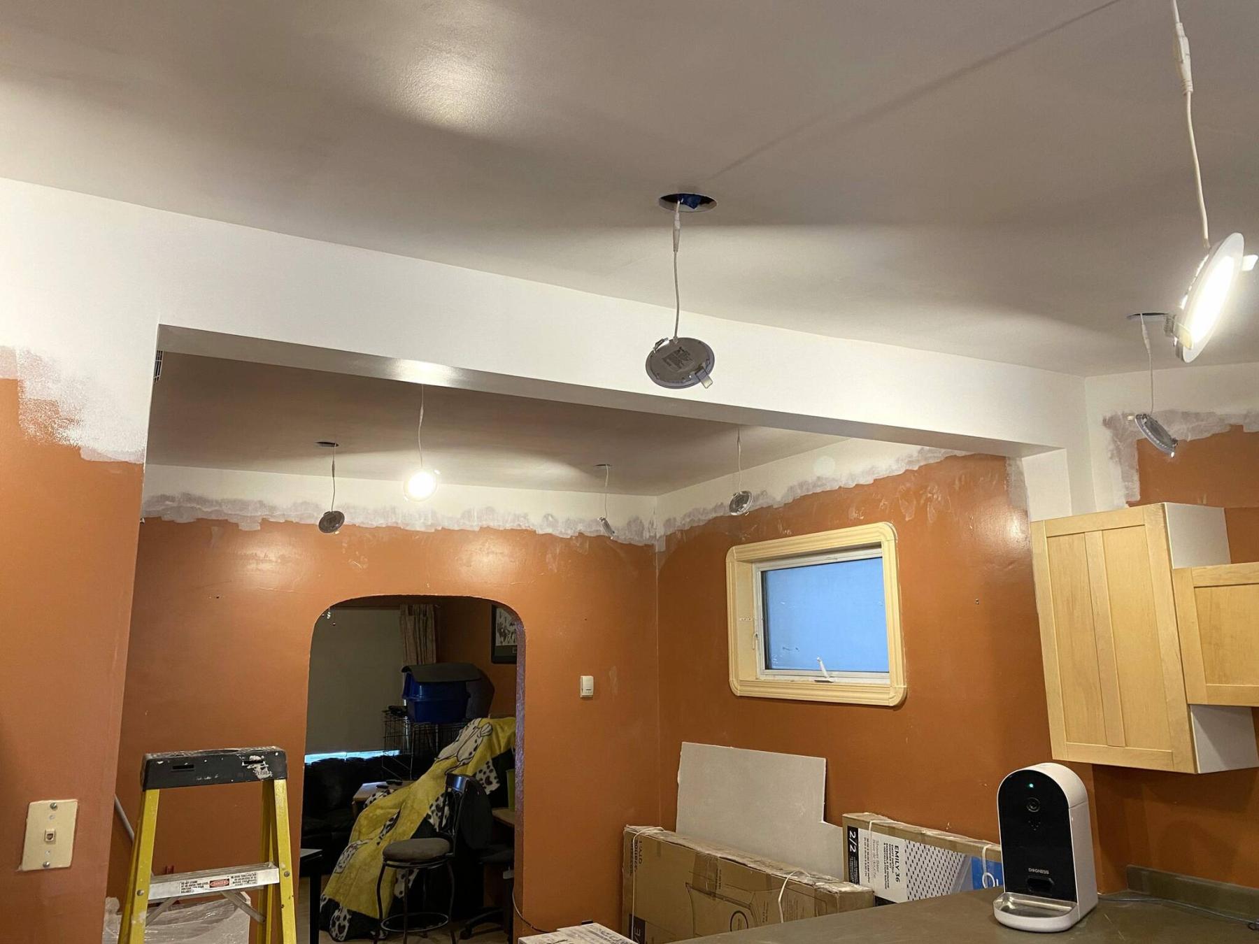 Two ceilings at the jobsite required attention; a ten-by-ten foot dining room plaster ceiling between the living room and the kitchen, as well as the entire 13-by-12 foot kitchen ceiling. The dining room would receive four new four-inch LEDs, while the kitchen would get eight four-inchers (on two separate circuits), and a five-inch LED at the back door entrance. This new lighting layout will greatly improve the overall lighting, as there was only one existing ceiling light in the dining room, and a few awkwardly placed lights in the kitchen.