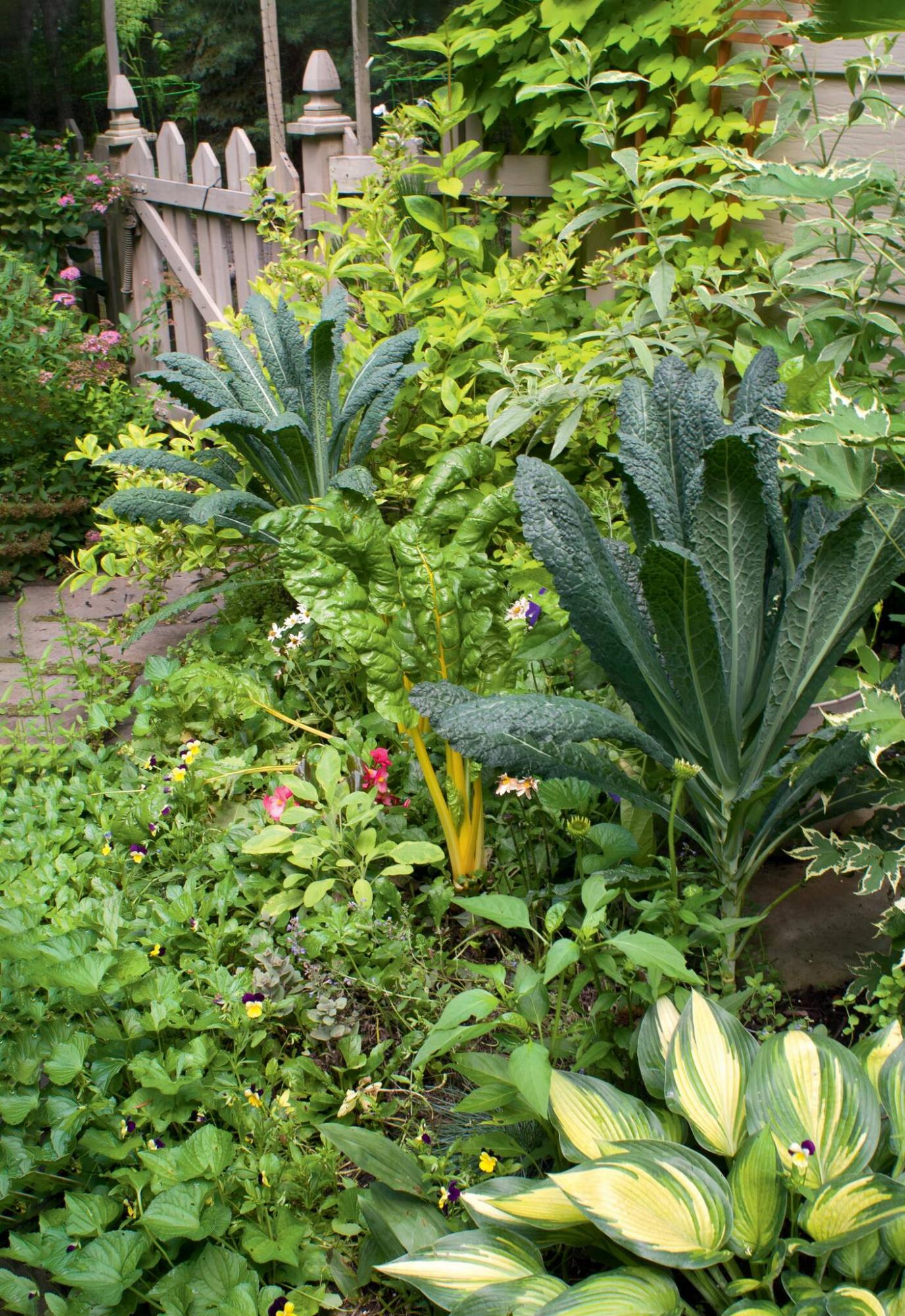 In one picturesque example in her book, Chung illustrates a layered edible garden that utilizes five layers of plants – a hops vine (Humulus lupulus) as the climber layer; roses for the shrub layer; hostas and sage as the perennial layer; kale, chard, and violas as the annual layer; and violets (Viola odorata) on the ground cover layer.