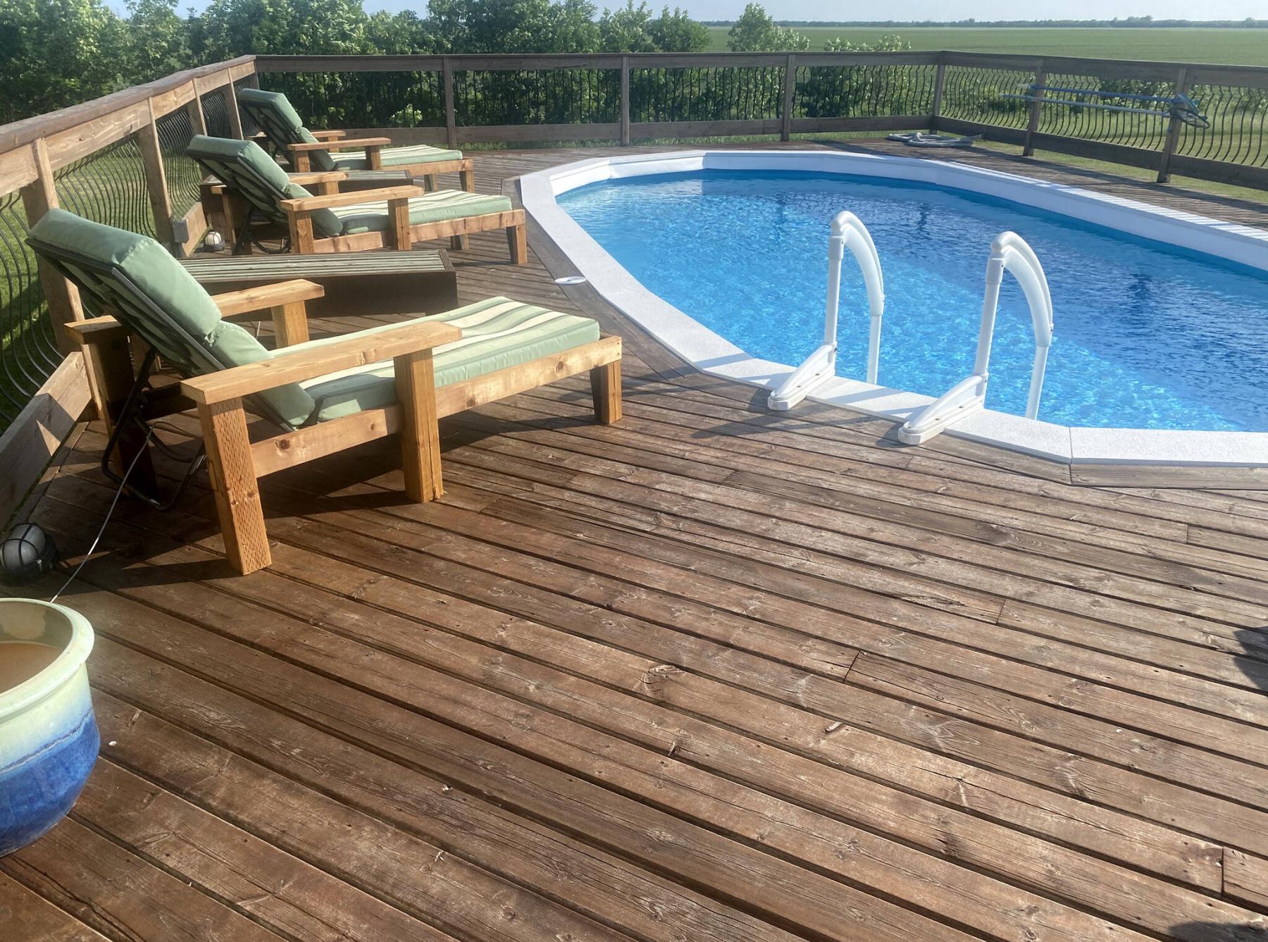 The following day, with Mother Nature again on my side, the back decks were tackled. Rather than moving all the patio furniture, tables, and BBQ off the decks, they were simply moved slightly to reveal enough of the decking surface for the ensuing oiling process. After another three hours, both tiers of the rear deck and around the pool had been completed. In that the sun had not faded the railings to the same degree, only the railing caps were oiled to match the top decking. When it was all said and done, only nine gallons of canola oil were used to revitalize my decks.