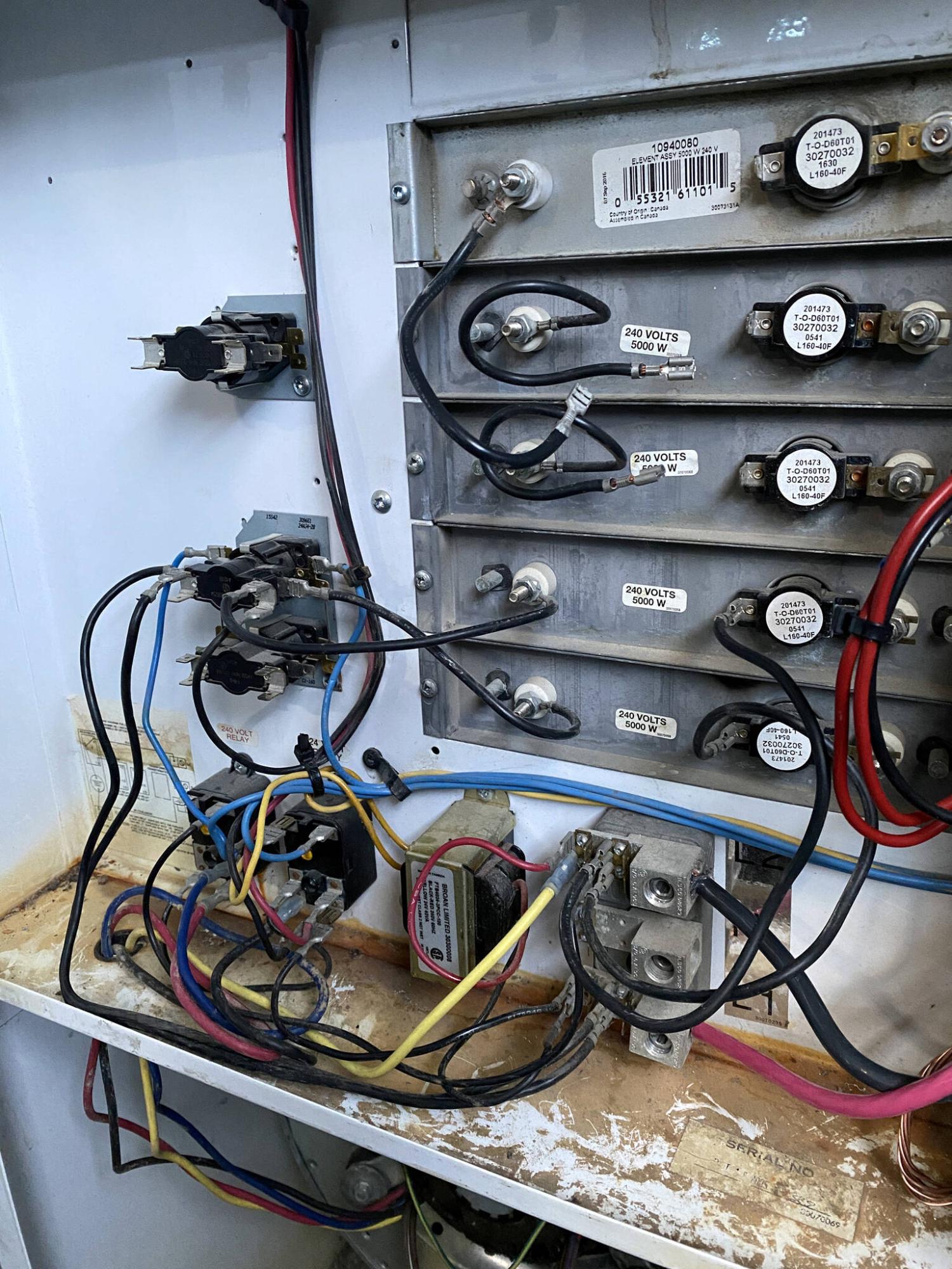 The furnace housing was placed on the concrete floor, with large rubber mats at all corners as a buffer. A new plenum with an 16-inch duct was requested, and mounted atop the furnace cabinet. A filter housing was also mounted at the return, so that filters could be used to prevents the build-up of dust and particles inside the unit. A new electrical line was fed from the 50-amp breaker (set to off position) introduced to the electrical panel in the basement of the house, to a breaker box (safety shut-off) mounted along the wall behind the furnace placement. The line was then connected to the posts in the furnace. With the power leads connected, three of the five elements were disabled, as were the leads to the relay switches that would control a staggered power-up when all five elements are in use. With the new setup, only two elements would be engaged, and they would both come on at the same time.