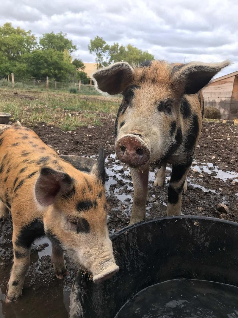 Pastured pigs at Oak Knoll Farm include Berkshire and Hereford breeds.