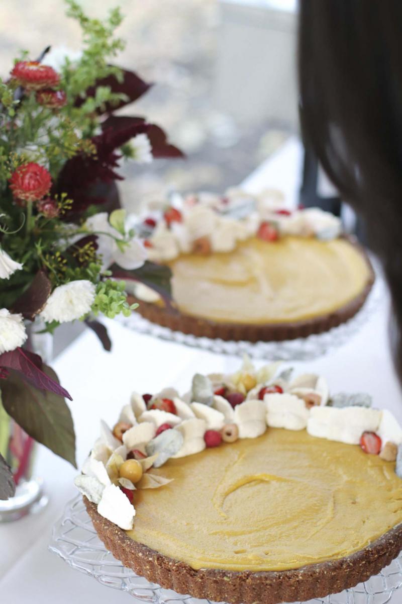Red kuri squash and cardamom pie with golden raspberries and candied sage.