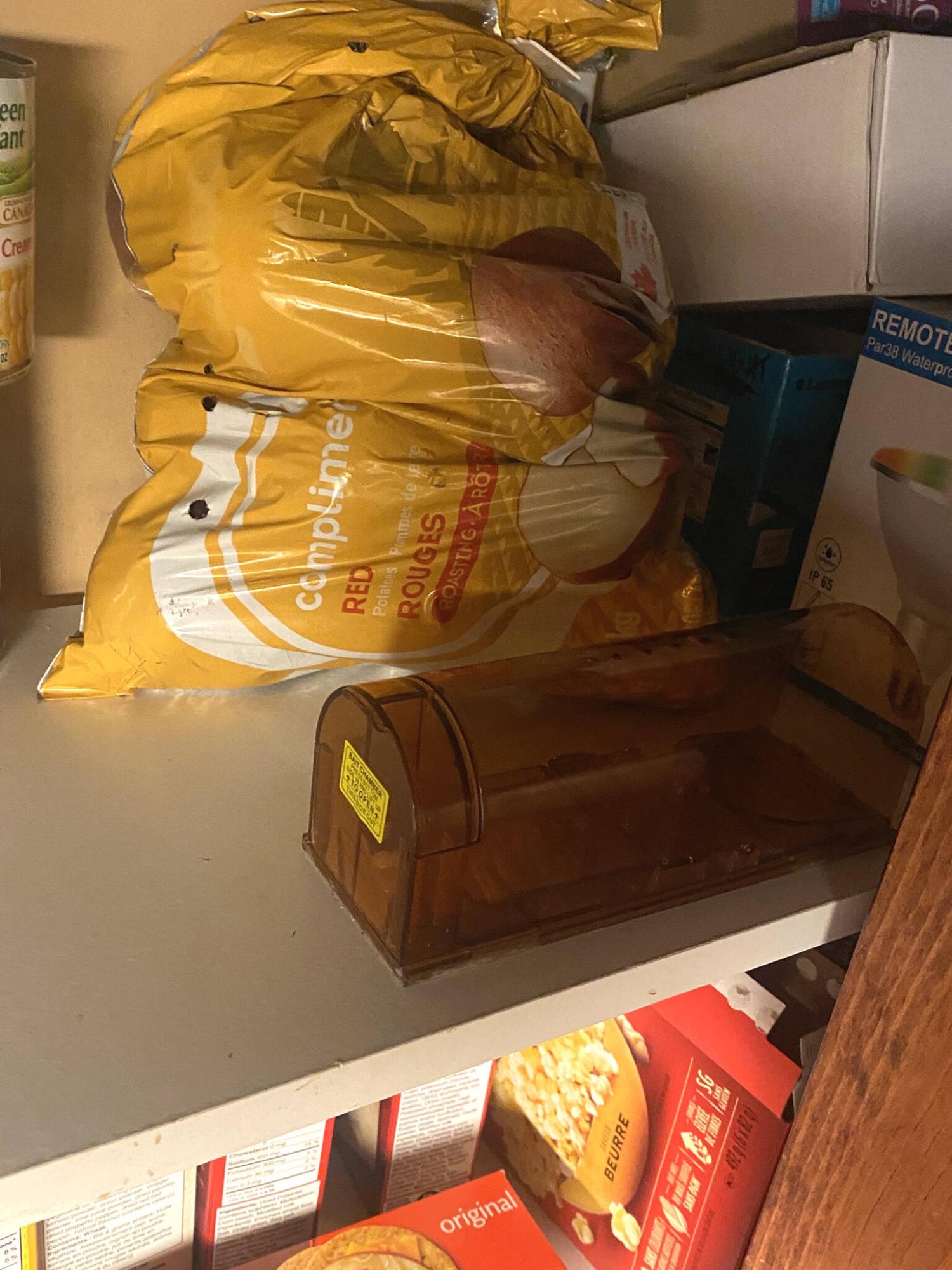 A live trap is placed on a shelf in the pantry, where a few mouse droppings were found earlier.