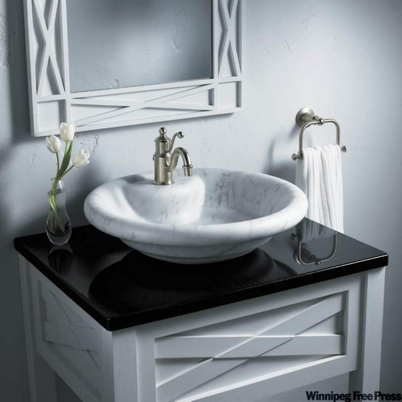 The couple's washstand vanity fit snuggly into the small space allotted for it. If you have a similar layout, you might want to consider using a similar piece of furniture and retrofit it as they did or you could also consider buying a lower-profile vanity like the ones pictured here (courtesy of Kohler) which will fit into a small space and are stylish.