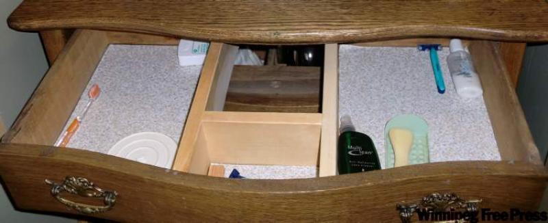 Don had to Macgyver the drawers so that the back would fit around the plumbing and be useable for storage. (See photo.) He cleverly switched out the normal ABS pipe for chrome piping which gave him the extra few inches needed to make everything fit. The vanity turned out beautifully and is a great piece in the couple's retirement home.
