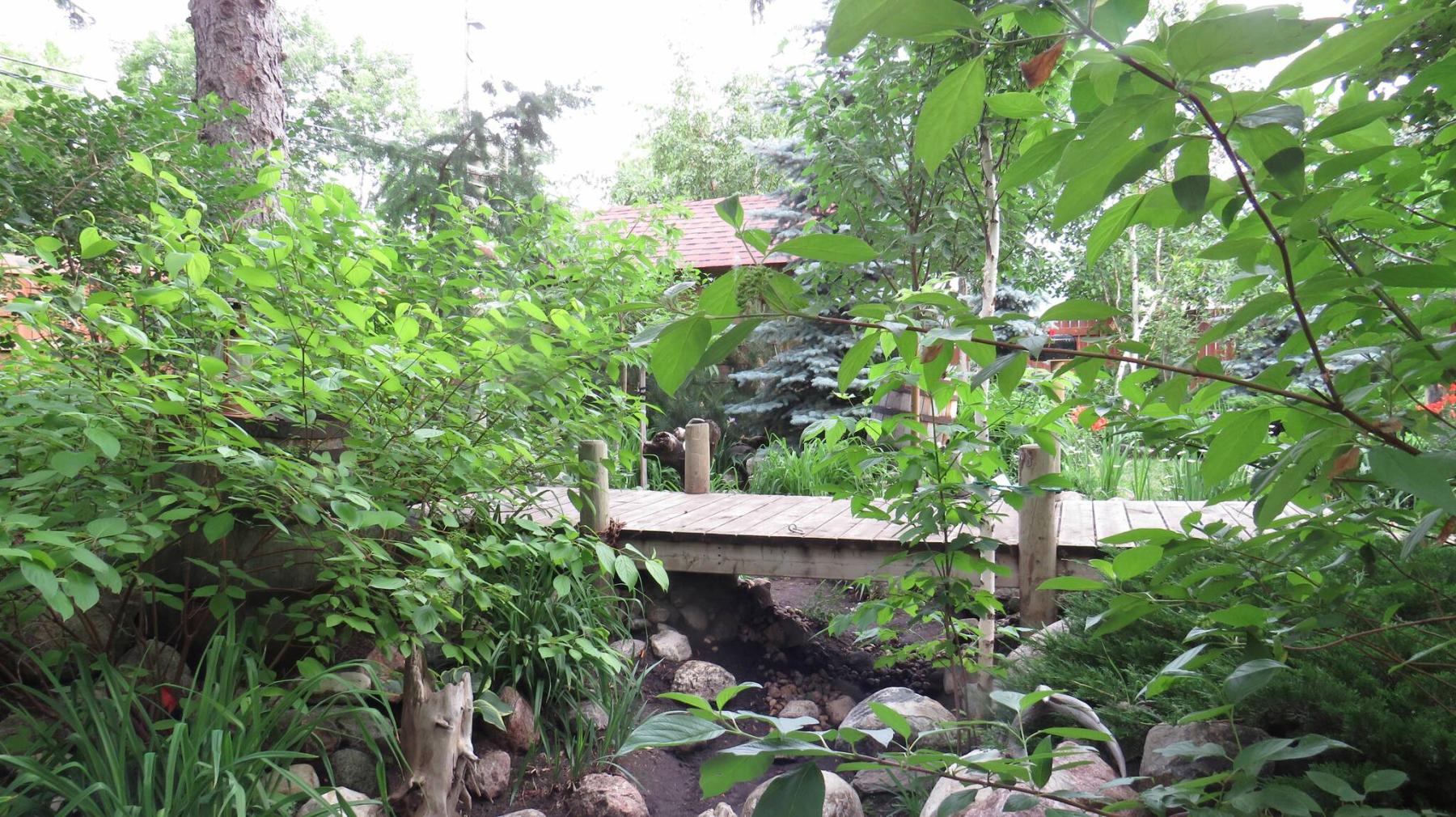Near the end of the boardwalk path is perhaps the biggest surprise as it transitions into a bridge over a creek dug out entirely by hand. Creating the creek took an entire summer, said Klassen. It extends about 55 feet or 16 metres to a log cabin which he also built by hand. There is water in the creek only in the spring when the snow melts or when there is rainfall and then the base of the creek might fill with a few inches of water before it percolates into the soil. This area is the shadiest part of the garden.