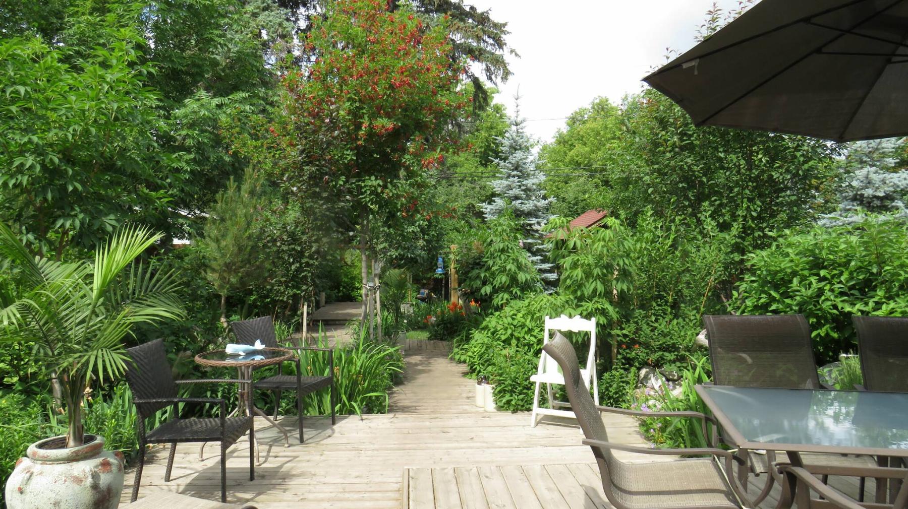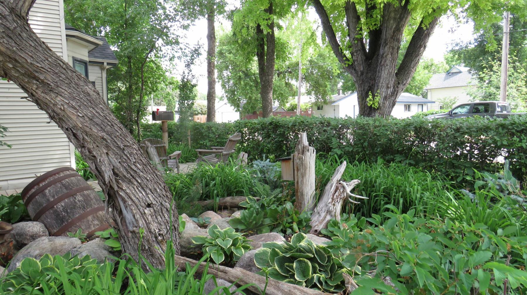 Last week on the first day of summer, I had a chance to tour Klassen’s extraordinary garden. Situated on a quiet, tree-lined street in the city of Portage, Klassen’s house was once a farmhouse that belonged to the Hill family who owned Hill’s Drug Store, which was started in 1901. The front of the 80-foot by 135-foot lot is still framed by a hedge which can be seen in an old photograph of the house. On the front boulevard stands a massive Silver Maple tree, easily 60 to 80 feet tall, its root-flare-like firmly planted feet and expansive girth (nine feet or 2.7 metres) denoting its advanced age.