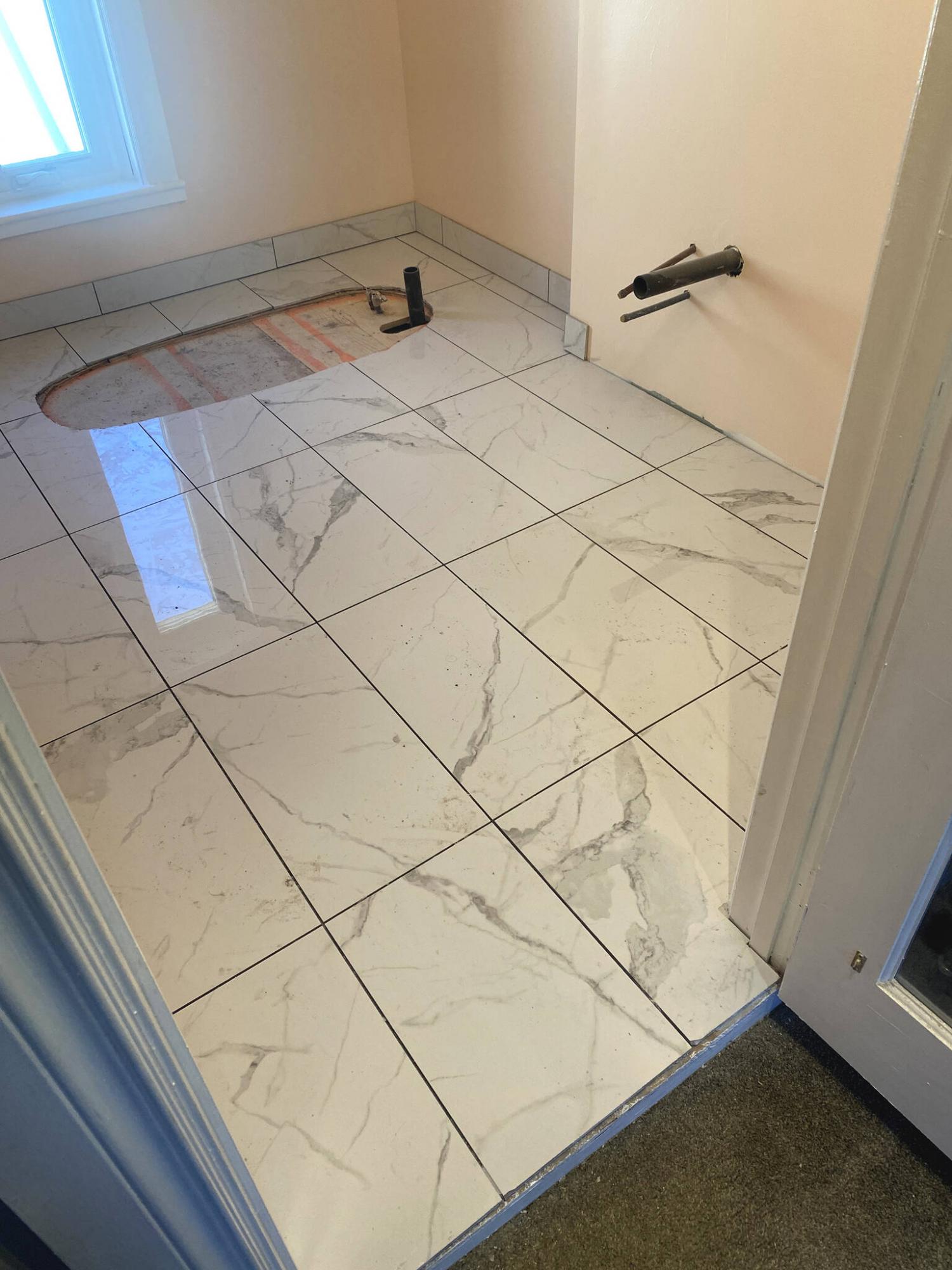 A 12x24-inch marble-esk ceramic tile was chosen by the homeowner. The tile layout was configured to minimize the potential of sliver tiles (thin strips) at any given area, despite the width change at the back of the room to accommodate the tub, and the closet nook opposite the vanity. The orientation of the tile’s long side is set with the long of the room. Tiling began at the back of the room, where the tub would stand. As such, it was necessary to pre-cut the tile to meet the planned void below the tub. Once the tiles were cut accordingly, the thinset adhesive was introduced and the tiles were placed one by one. Tiny rubber spacers are used throughout to create the one-eighth inch gap between all tiles, as well as below the bottom edge of the four-inch tiled baseboard.