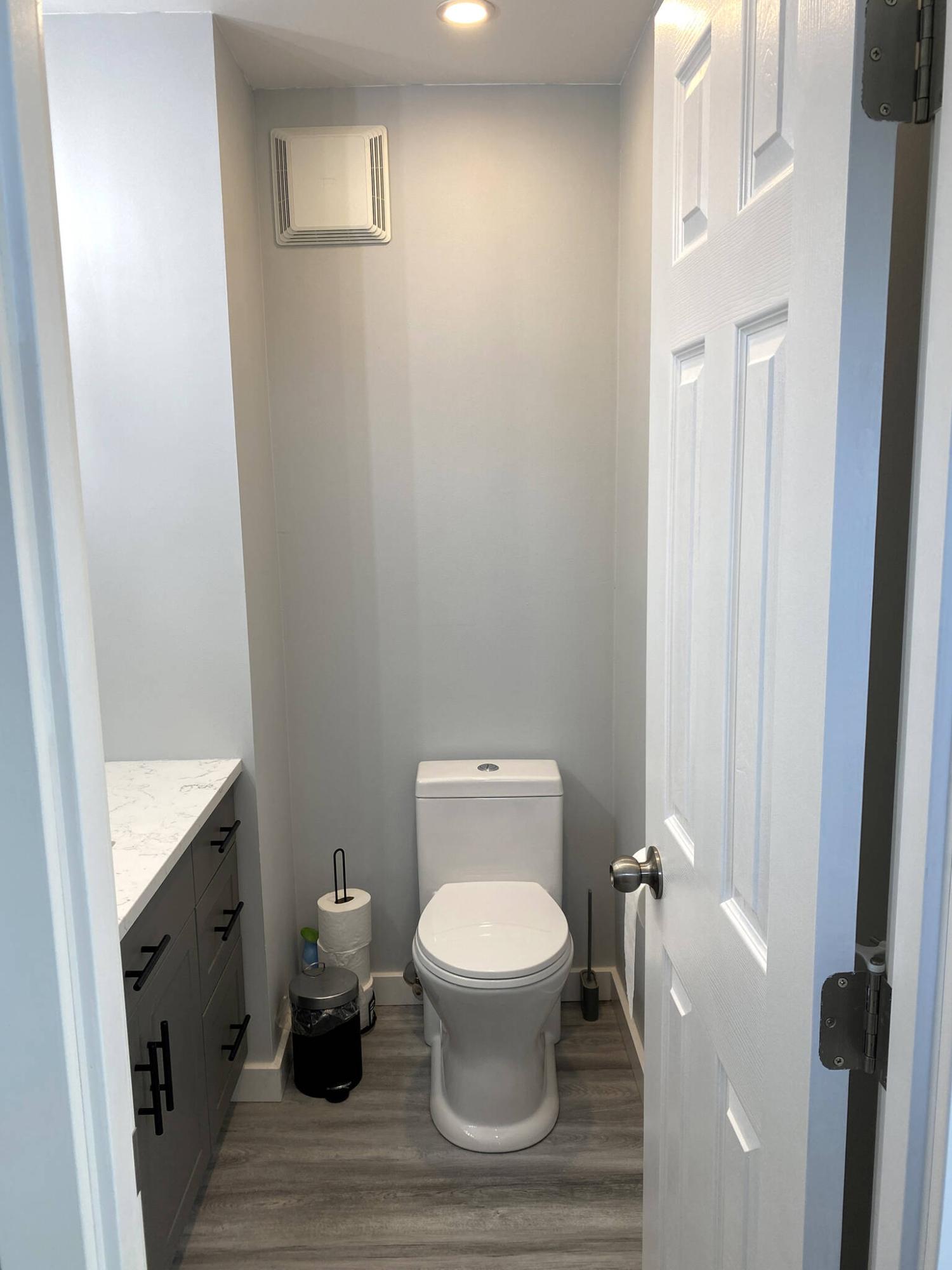 A new white one-piece toilet was also installed, that blends nicely with the white marble-esk countertop, white trim and new bathroom door. A large 36-inch circular vanity mirror with black frame is mounted on the wall below the newly installed black vanity light fixture, fitted with old-time LED bulbs. The towel rack and toilet dispenser are also flat black, adding to the several black features in the room. The walls were painted light grey throughout other than the vanity wall, which is of a slightly darker grey-tone and serves as a sort of feature wall within this tight space. Once fully populated, the bathroom colours are concise, with bold black accents throughout. The blend of black and white, with various tones of grey throughout provide a magical yet soothing blend of subtlety within this main floor two-piece bathroom — a neutral canvas upon which any array of vibrant colours can be added, easily adaptable to suit any season or occasion. The high contrast of black against light grey and white is striking, and no doubt provide a lasting impression.