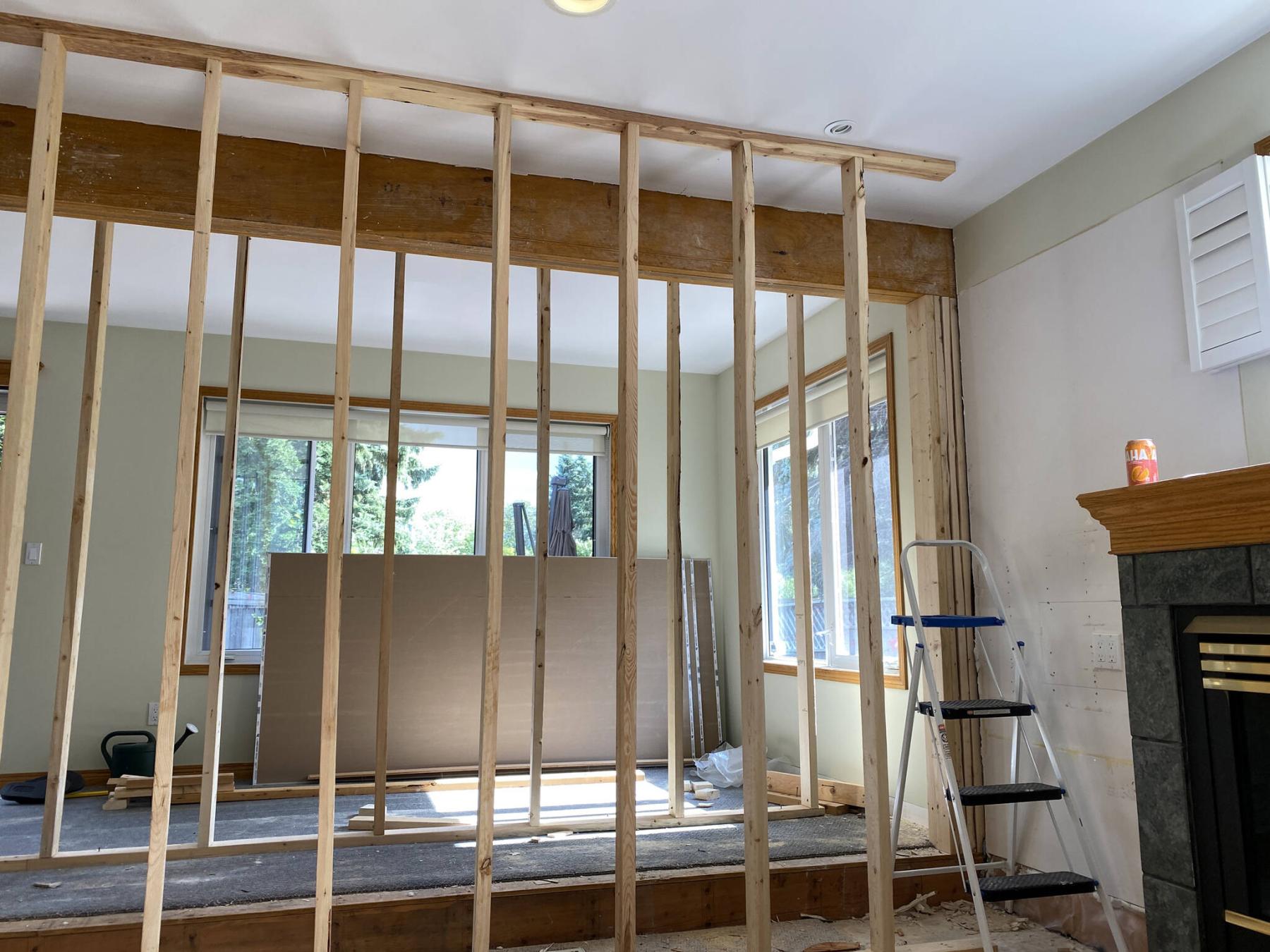 With the new beam in place, the temporary walls are then systematically removed one stud at a time, until all that remains is the new beam and posts, providing the first true hint of the sought-after open concept. Any existing electrical instances had been reconfigured to accommodate the beam introduction. With the new beam in place, additional framing was added to widen the beam, and allow for the required wall switches, and outlet. The new structure is then sheathed with drywall, and ensuing tape, corner bead and mud coats would ready the beam and posts for primer and paint within a few short days.