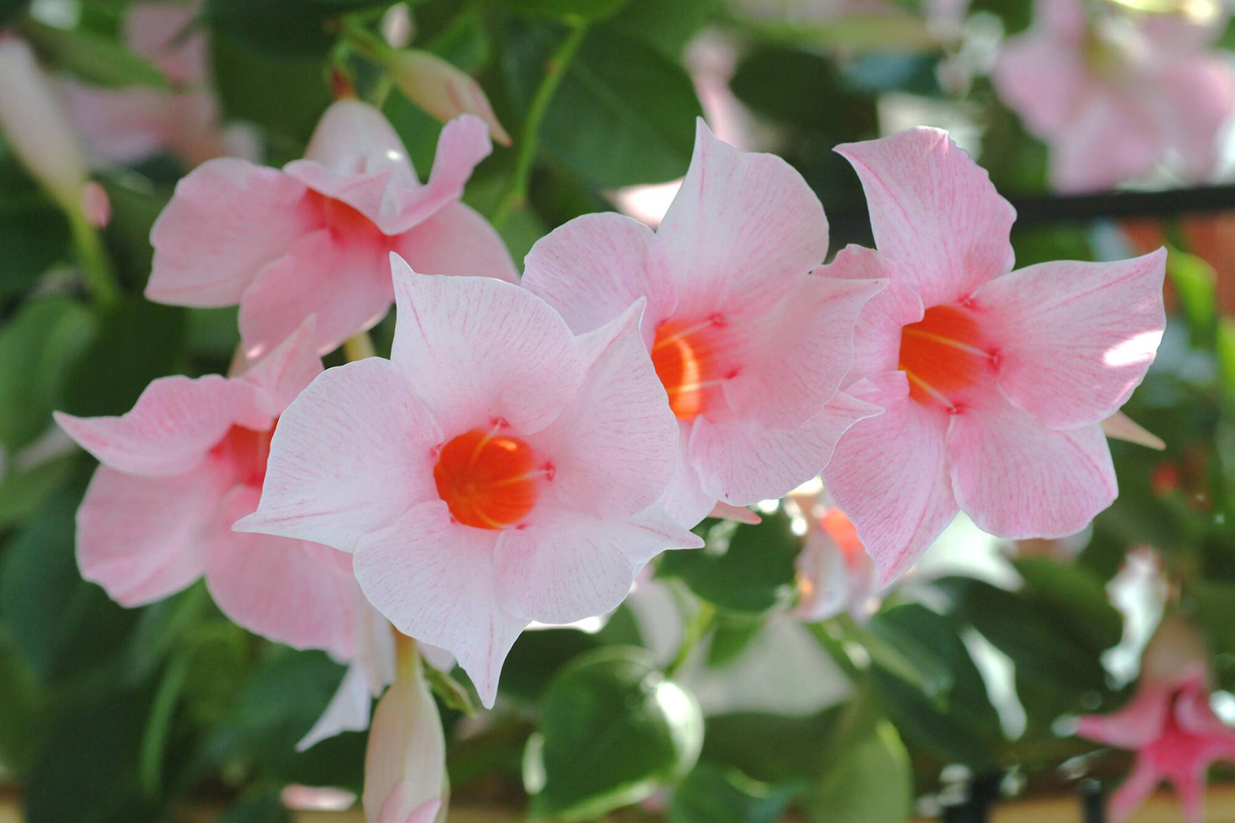 Mandevilla SunParasol Original Cream Pink has soft pink flowers with brushstrokes of cream and a glowing orange centre.