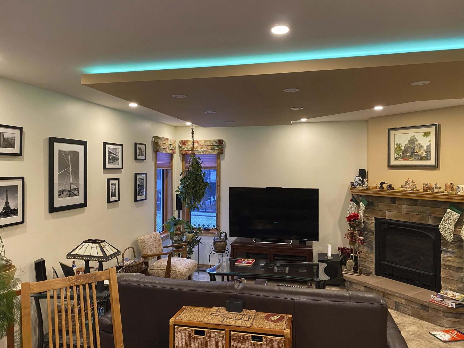 Throughout the process, the slim LED pot lights were systematically installed by drilling out four-inch holes at every pre-ordained location, and subsequent tie-in to the wiring achieved prior to the drywall stage. A final one-by-three wooden edge was mounted along the outer perimeter of the tray ceiling, to create a trough within which the strip lighting could be concealed. The strip-lighting was then inserted and connected to the dedicated circuit for tray perimeter lighting. Although the on-off of the strip-lighting can be controlled by the new wall switch, it is the remote control (and mobile app) that provides the ultimate experience via a multitude of colour options, dimming, strobe, and fade-in/fade-out features.