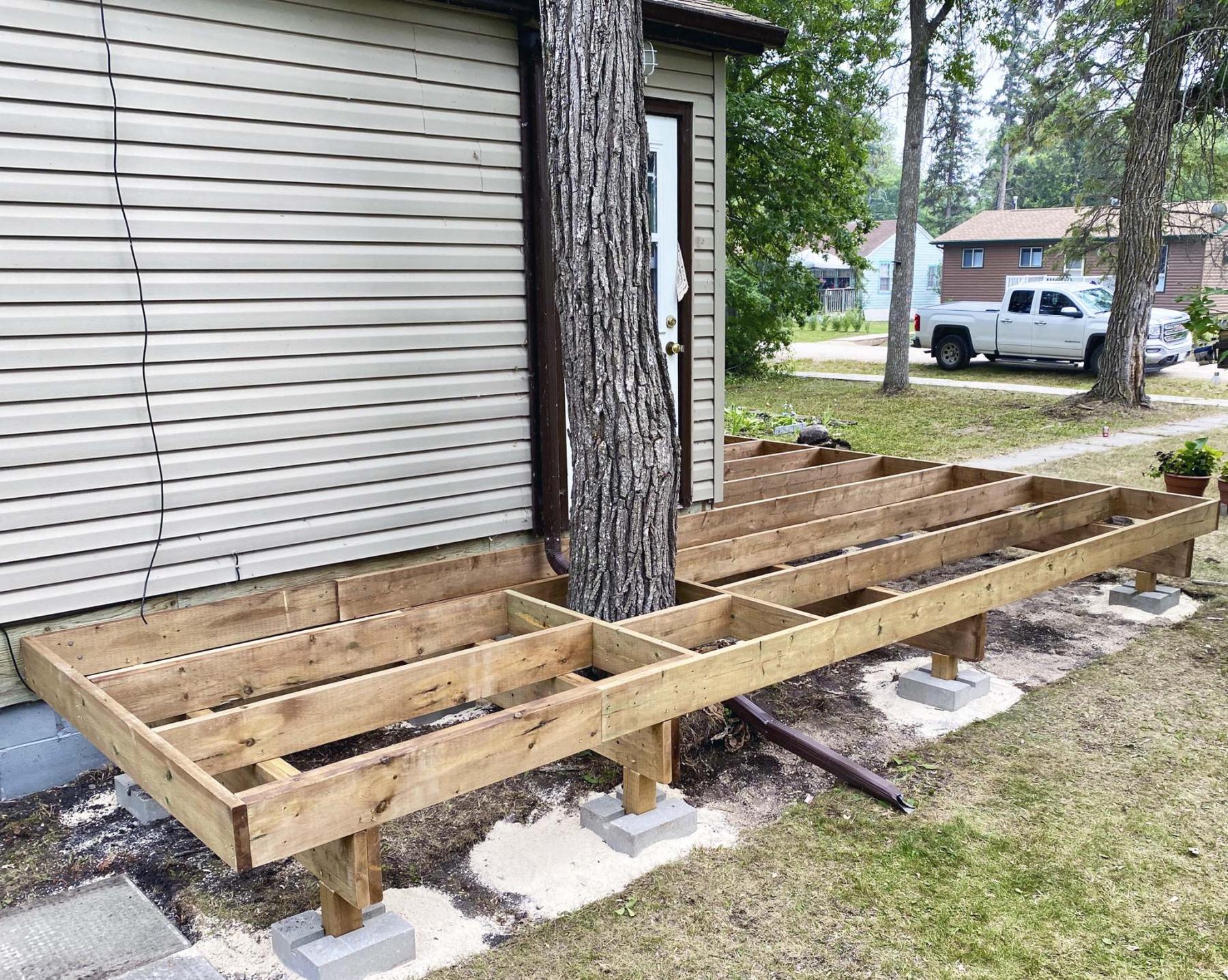 On occasion, the intended footprint of a new deck design layout is initially compromised by nature. As such, a shrub, flower bed, or the shallow root system of a nearby spruce tree must be addressed before the build can begin.