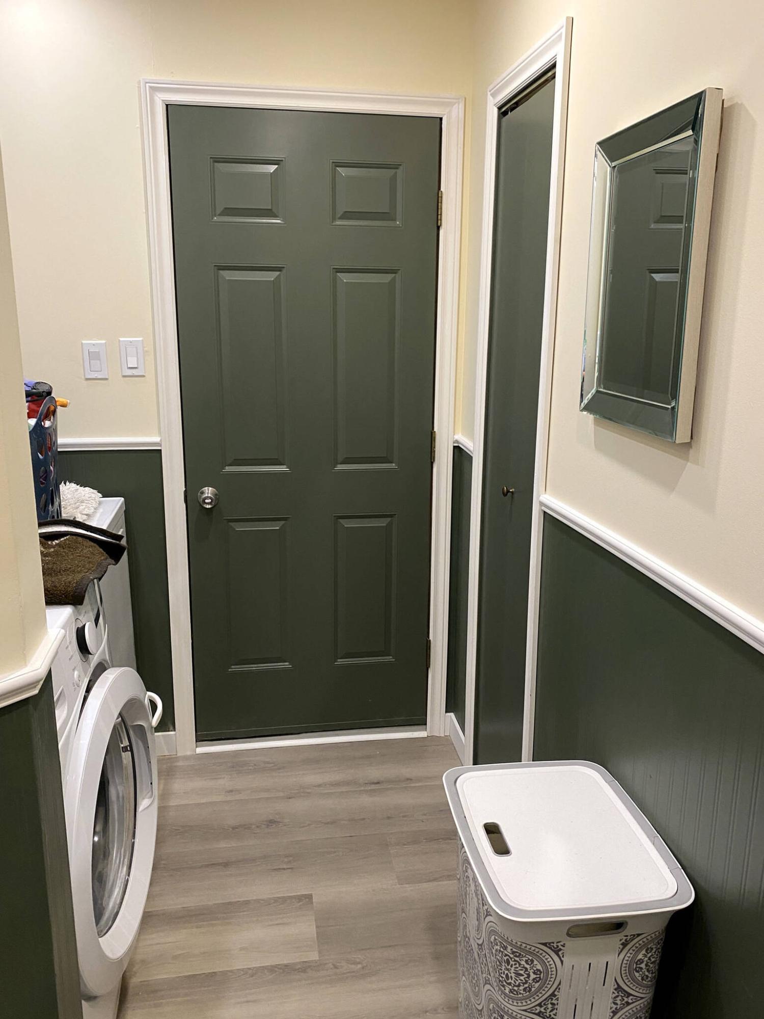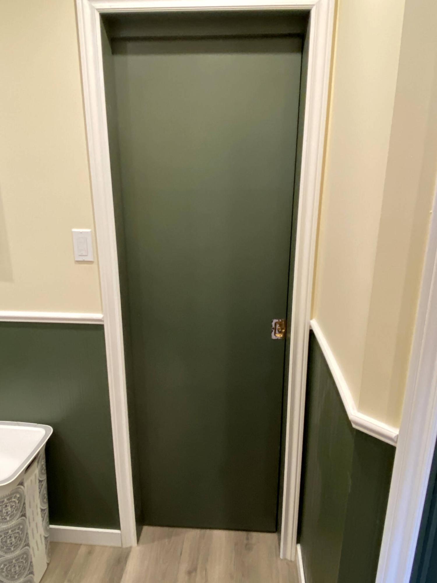 The decision to forgo recycling the old casings and chair rails proved to be the appropriate course of action. Not only does the new white trim clearly outline the wall colours throughout, but the bottoms of the casings now meet the vinyl flooring without any gaps, an issue that would have been impossible to overlook had the old casings remained in place.