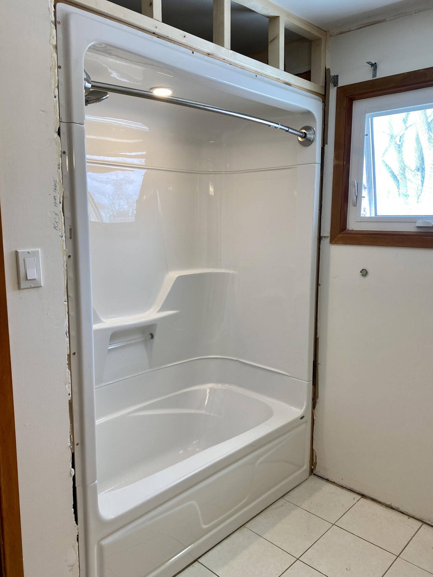 Although the tub surround is rigid, and rests firmly level on the sub-floor within the cavity inset, the unit must also be fastened along the vertical flange at each end of the unit to prevent any nominal swaying of the unit when in use. Furthermore, framing along the top of the unit and the bathroom ceiling is introduced to fill the gap, a flush bulkhead with the adjacent wall to which the upper section’s valance can also be fastened. With the unit secured and all functionality tested, the final steps will include the required drywall along the sides of the unit, as well as bulkhead area. Once the drywall has been tapped and mudded, sanded and painted, all seams along the drywall edges will then receive a caulk/silicone to prevent moisture from breaching the space unwantedly. A thicker bead of silicone is used along the bottom edge of the tub, to eliminate water-breach along the floor tile.