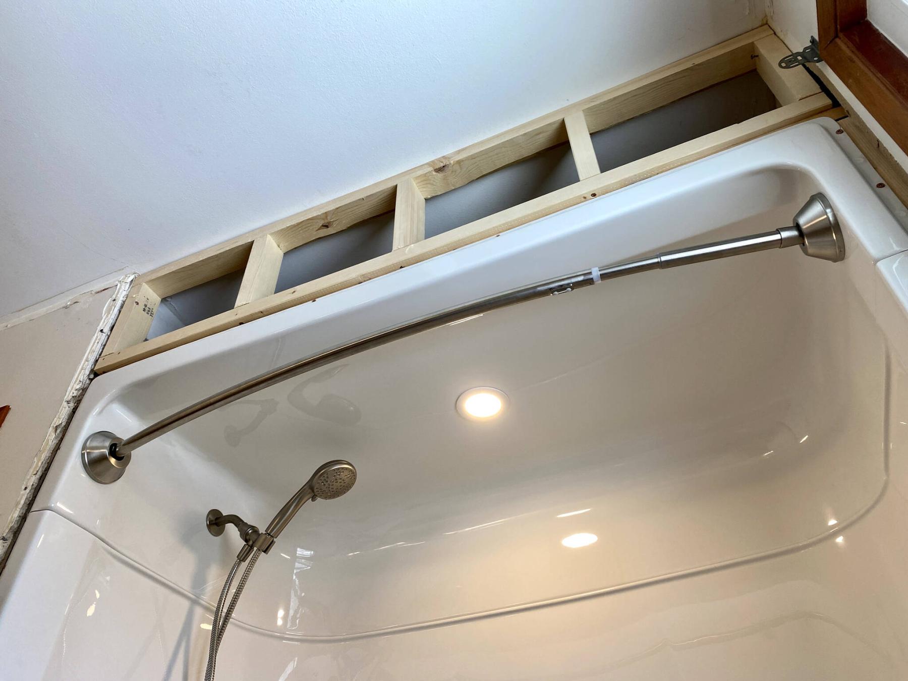 A bulkhead is framed above the unit to fill the gap between the upper section of the tub surround and the bathroom ceiling.