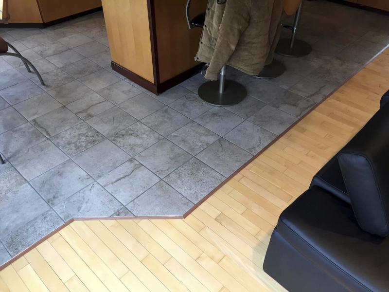 The existing hardwood adjacent to the finished floor tile, fitted with chrome 90-degree edge and custom wood transition.